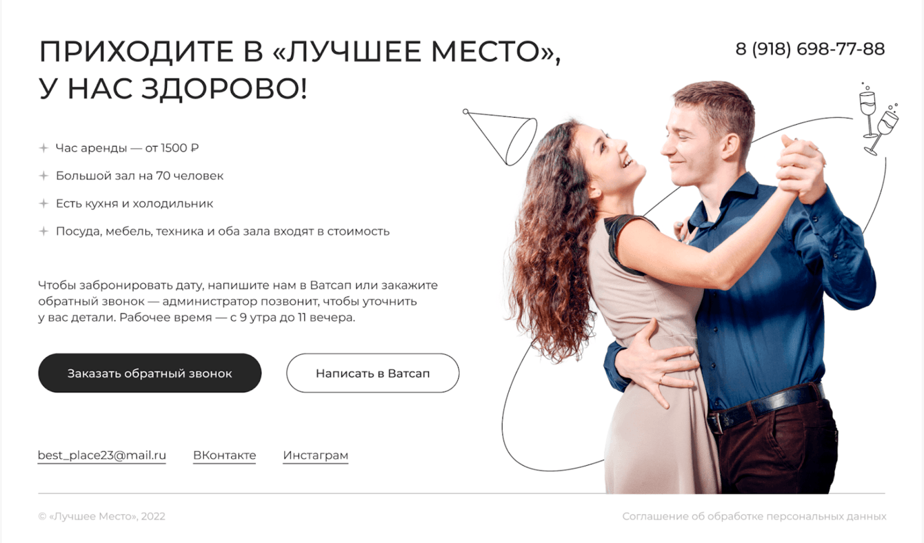 Чтобы дополнительно замотивировать человека на обращение к нашему клиенту, в конце страницы еще раз коротко вынесли ключевые преимущества. Также добавили фотографию семейной пары — она как бы говорит своим видом, что в «Лучшее место» можно сходить со своей второй половиной и здорово повеселиться.