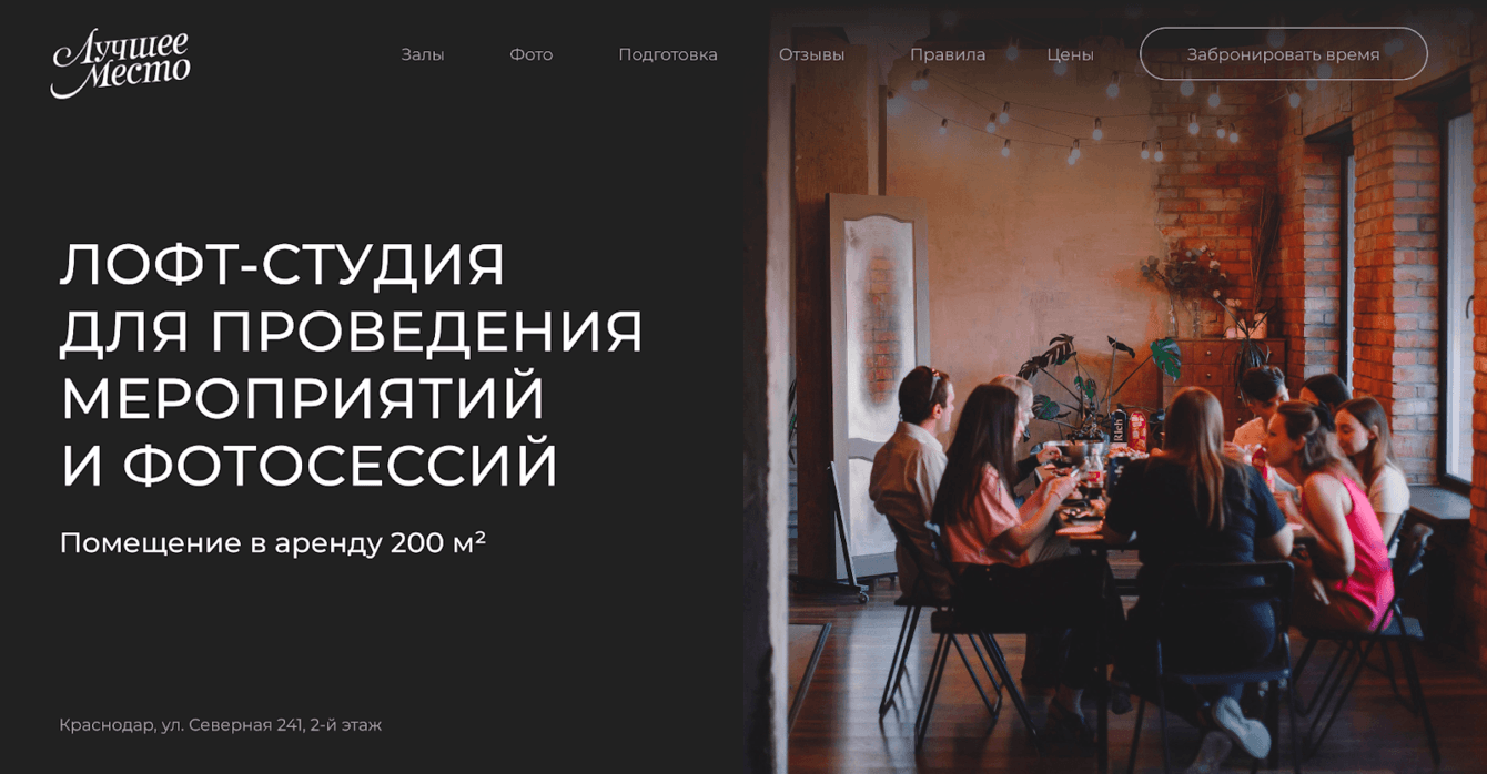На первом экране нам было важно сразу дать понять людям, куда они попали и что клиент предлагает в качестве услуги. Плюс надо было замотивировать целевую аудиторию продолжить изучение страницы. Для этой задачи мы выбрали концепцию понятного заголовка и большой красивой фотографии — сформулировали, что мы предлагаем гостям, и сразу показали им, как здорово будет провести время в арендованном зале.