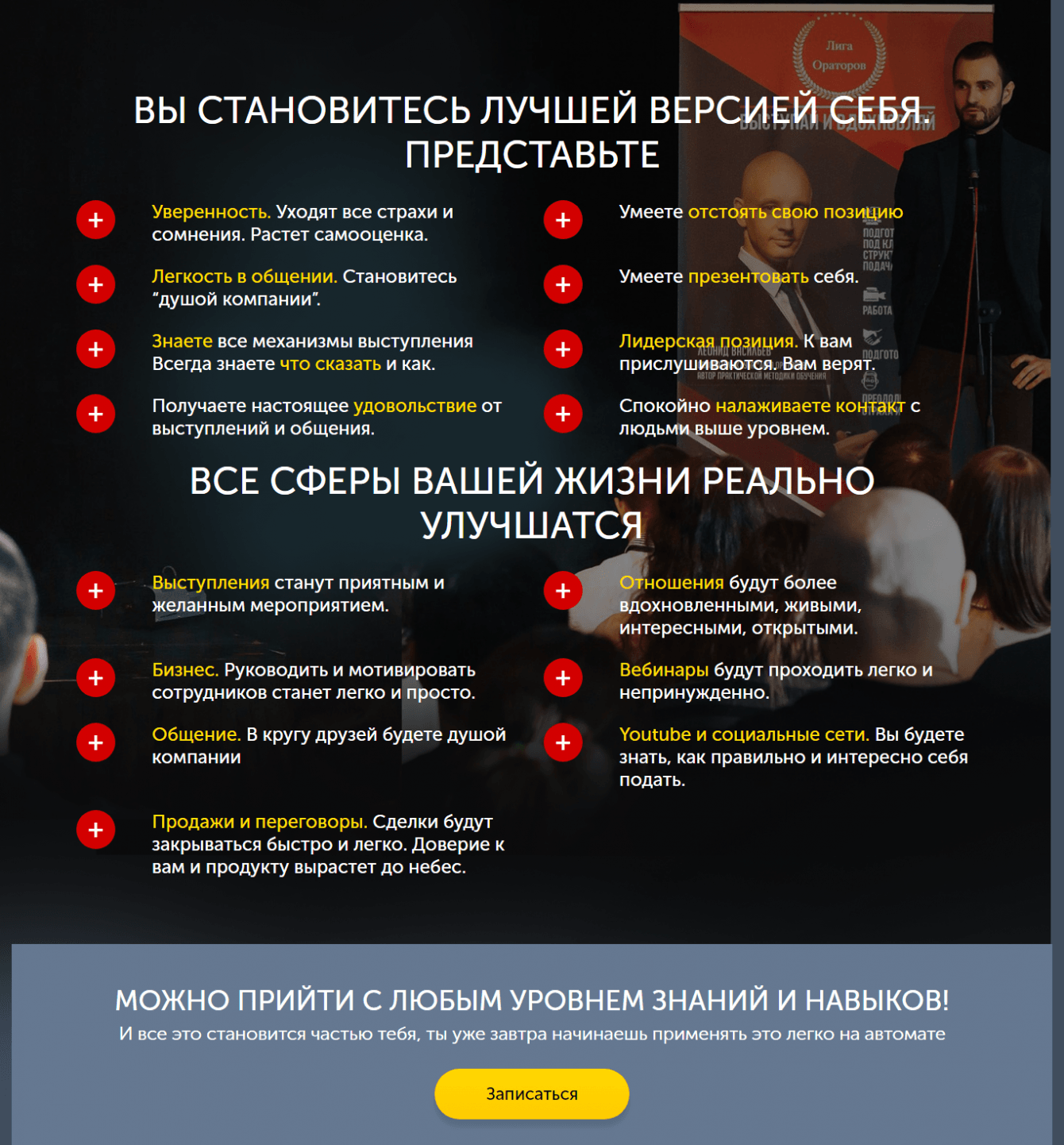 Разработать удобный лендинг для школы ораторского искусства "Лига ораторов", который позволит будущим выпускникам познакомиться с наставниками, узнать расписание занятий и записаться в один клик.