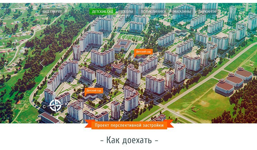3. Встроили на страницу интерактивную карту, чтобы пользователь мог подробно ознакомиться с проектом микрорайона. Карта позволяет изучить вид сверху, рассмотреть проект в 3D, исследовать инфраструктуру и отдельные объекты микрорайона.