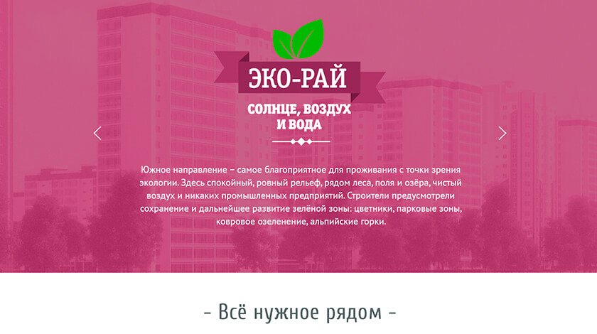 «У нового жилого микрорайона должен быть яркий и «живой» сайт», — подумали мы, изучая ТЗ. И реализовали эту идею в дизайне. Уже в шапке использовали яркие цвета и оригинальные графические элементы. Добавили света, цвета и энергии во все блоки и элементы сайта — слайдер, карту, карточки квартир, форму оформления подписки. Но не забыли и о функциональном назначении ресурса.