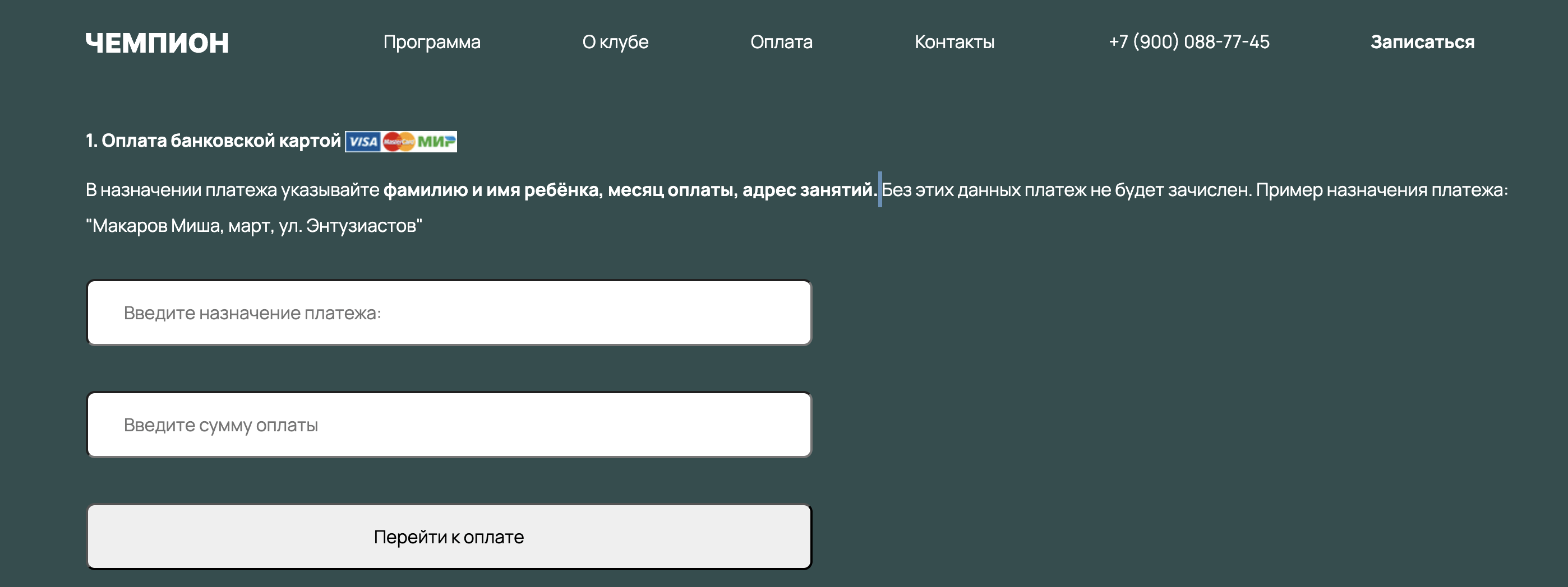 Онлайн-оплата реализована просто, через виджет "Промсвязьбанка". Из-за того, что клиенты вносят абсолютно разные суммы, создавать "товары" с фиксированной стоимостью, в этом случае было нелогично.