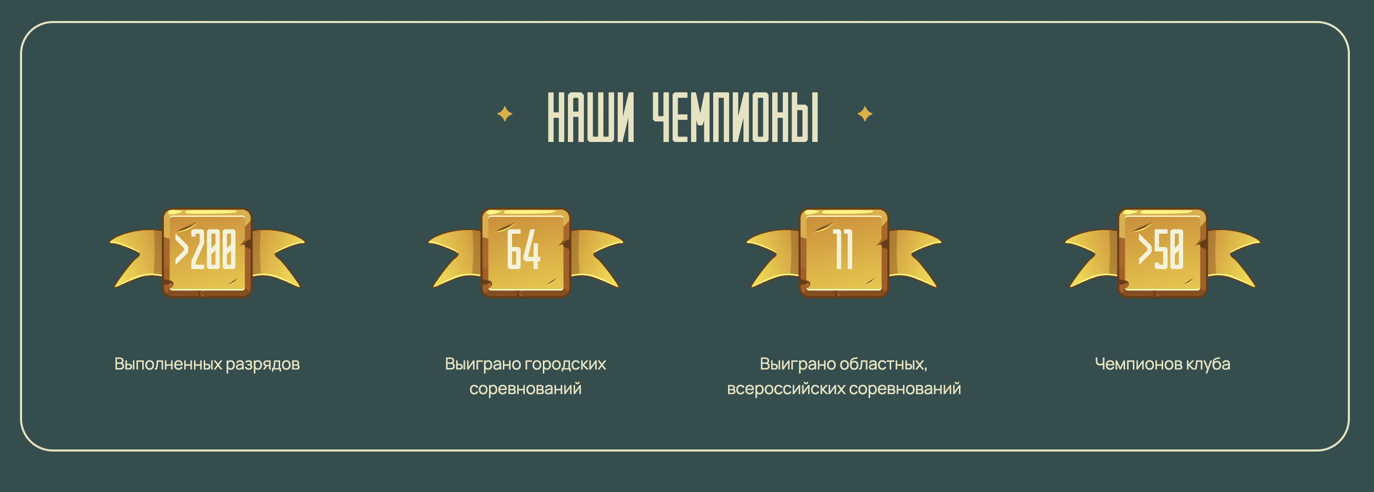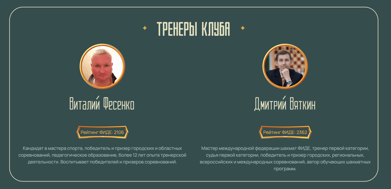 Для тренеров нужно было создать блок с рейтингом, потому что в шахматном мире, важно какой рейтинг у игрока и тем более у тренера. Поэтому приняли решение оформить блок по типу игрового персонажа с его характеристиками. Хотелось конечно дать больше характеристик, но тут нашу творческую фантазию придержал заказчик и попросил чтобы ничего лишнего не было.