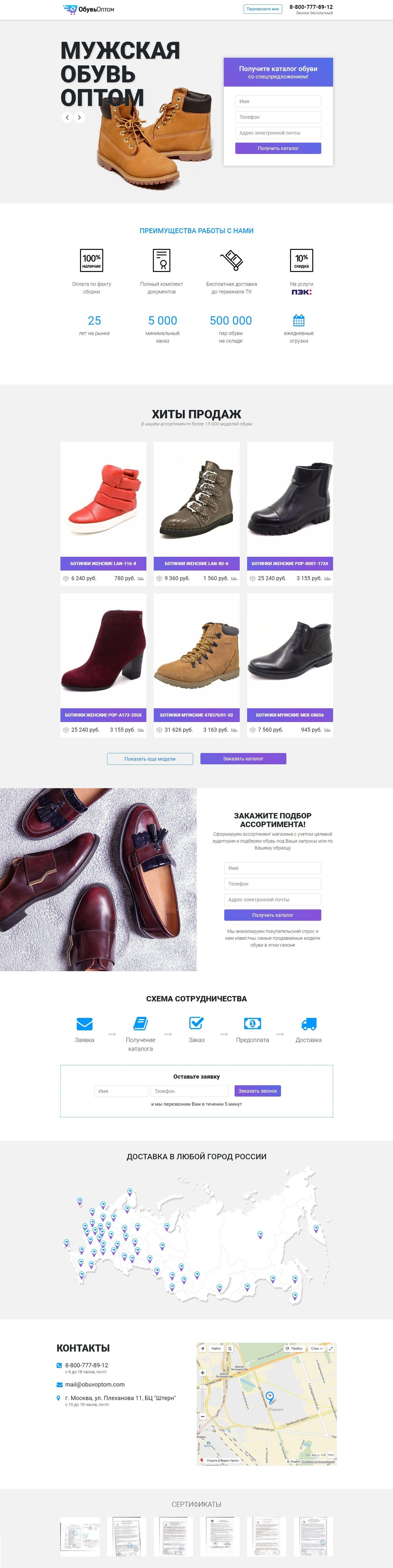 Для рекламной компании оптового магазина заказали разработать одностраничный сайт, для сбора информации о клиентах и приема заказов. А также хорошо и понятно представить информацию и том, чем занимается b2b сайт obuvoptom.com.