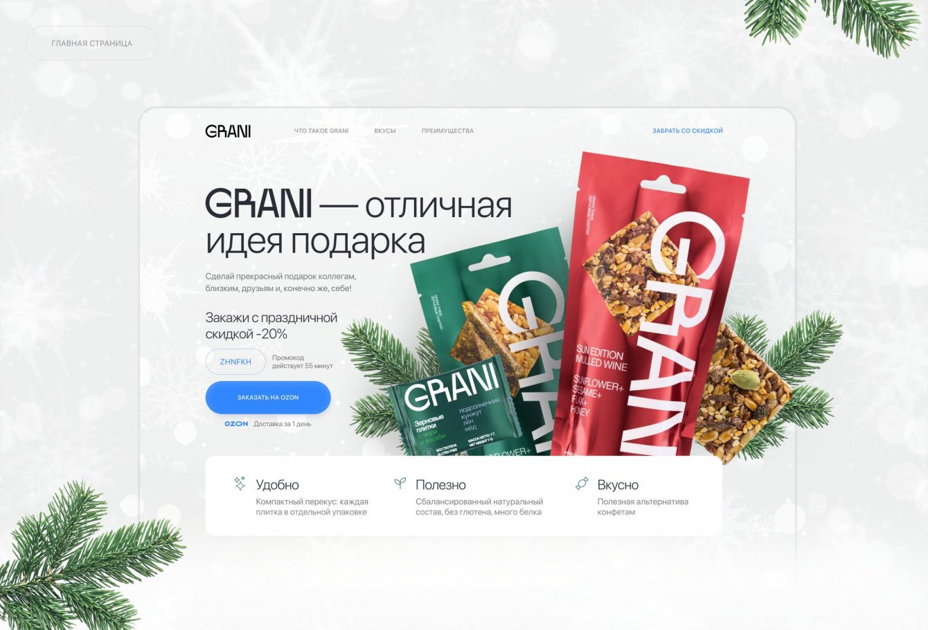 Разработать дизайн посадочной страницы для оригинальных снэков GRANI, который поможет: