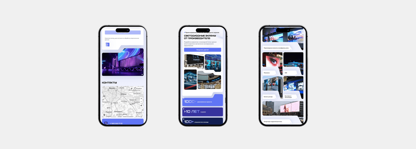 Мы уделили внимание оптимизации: картинки сжали через современный формат, подключили SSR-рендеринг, чтобы сайт летал даже на слабых устройствах. Всё это особенно важно для изображений с высокой детализацией, которыми насыщены LED-проекты.