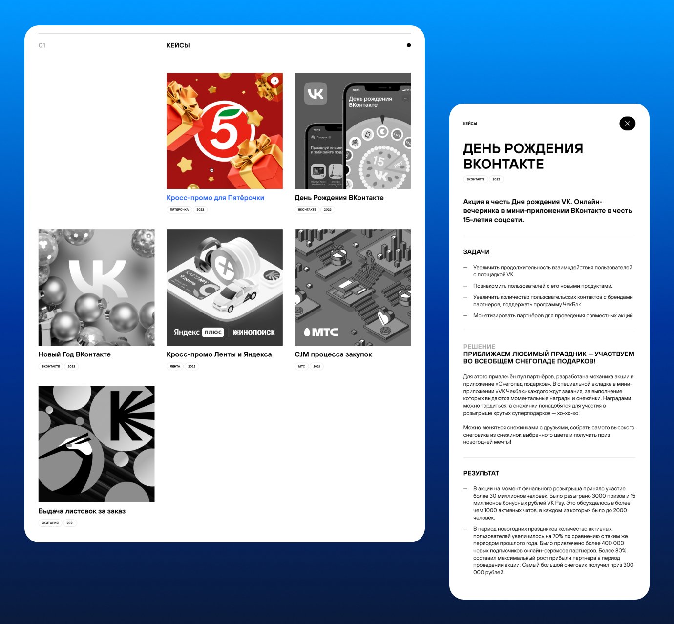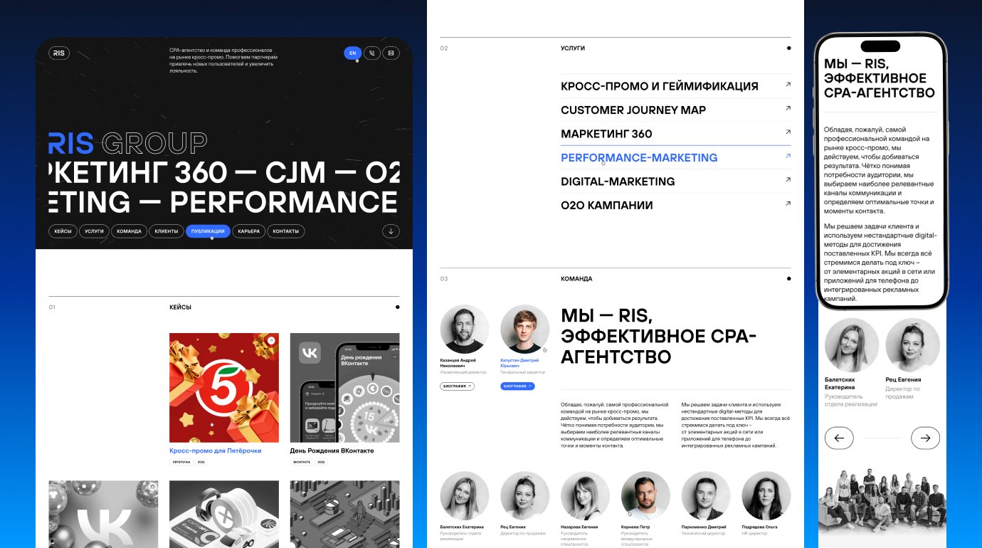 Для демонстрации возможностей компании RIS Group было важно продумать стиль подачи кейсов и услуг. Совместно с клиентом подготовили текстовый и визуальный контент, отражающий высокий уровень экспертизы RIS Group.
