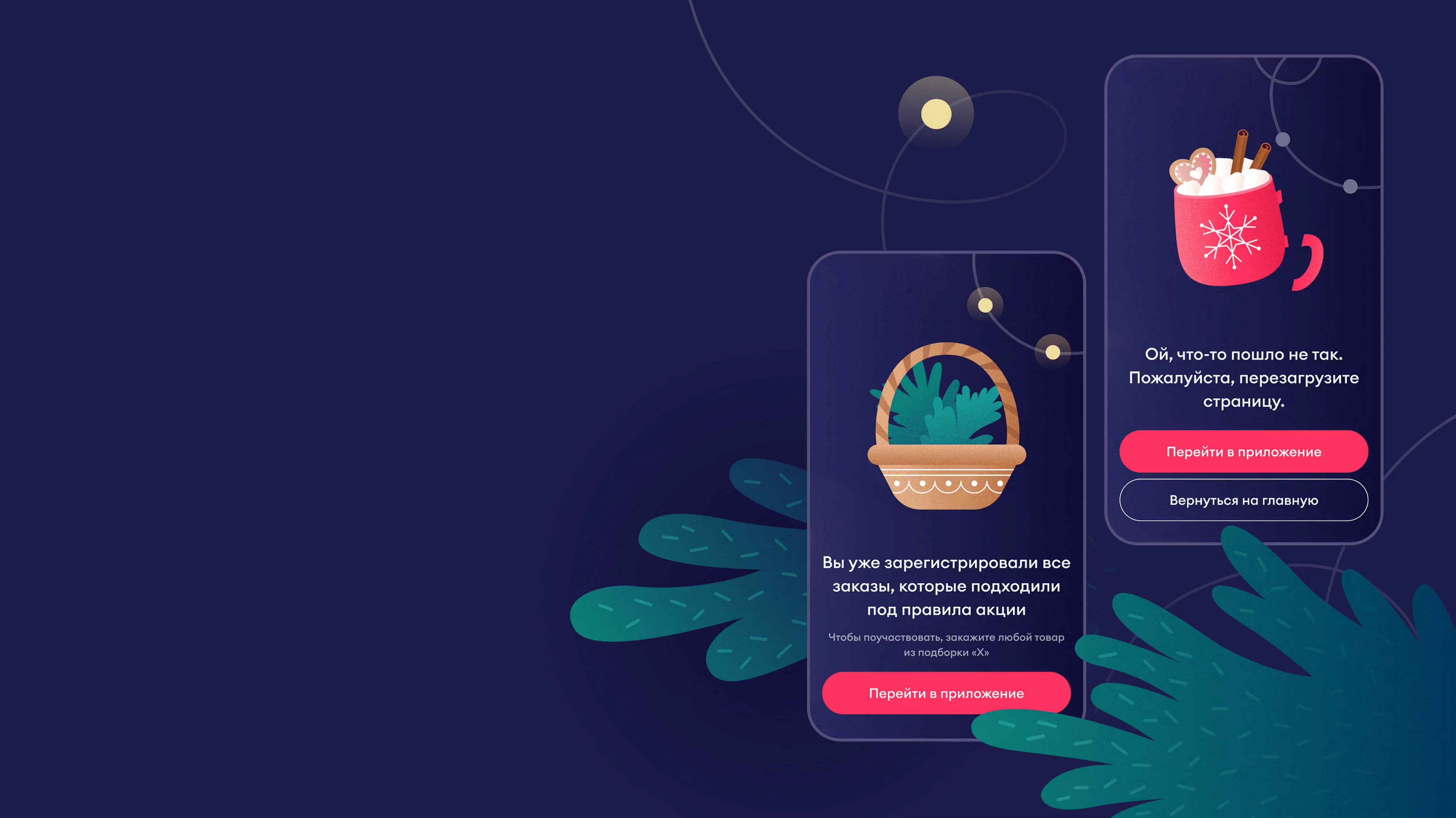 Прежде, чем приступить к дизайну, собрали мудборды, чтобы найти цветовые решения и стилевую концепцию. Выбрали сине-фиолетовые цвета и образ «ночной елки» с мешком подарков под ней, чтобы отстроиться от конкурентов. Для поддержания настроения отрисовали ряд иллюстраций с уютным эффектом «шума» — оформления кружек и другие новогодние атрибуты: еловые лапы, варежки и пряники, а также набор рекламных баннеров