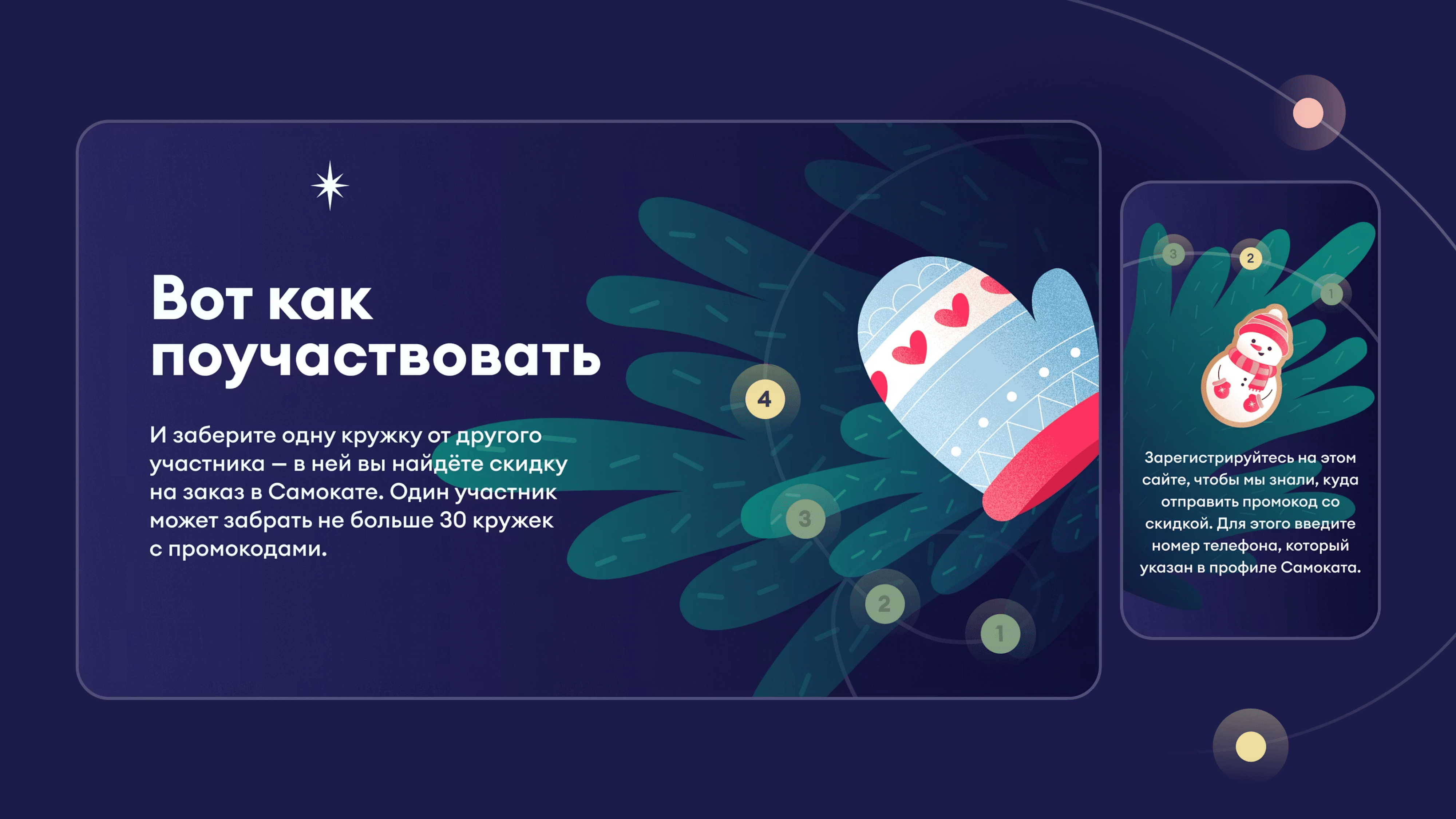 Создав и «подвесив» кружку, пользователь может «забрать» любую из других — и получить случайный подарок: промокод или скидку, которые можно потратить в приложении Самоката.