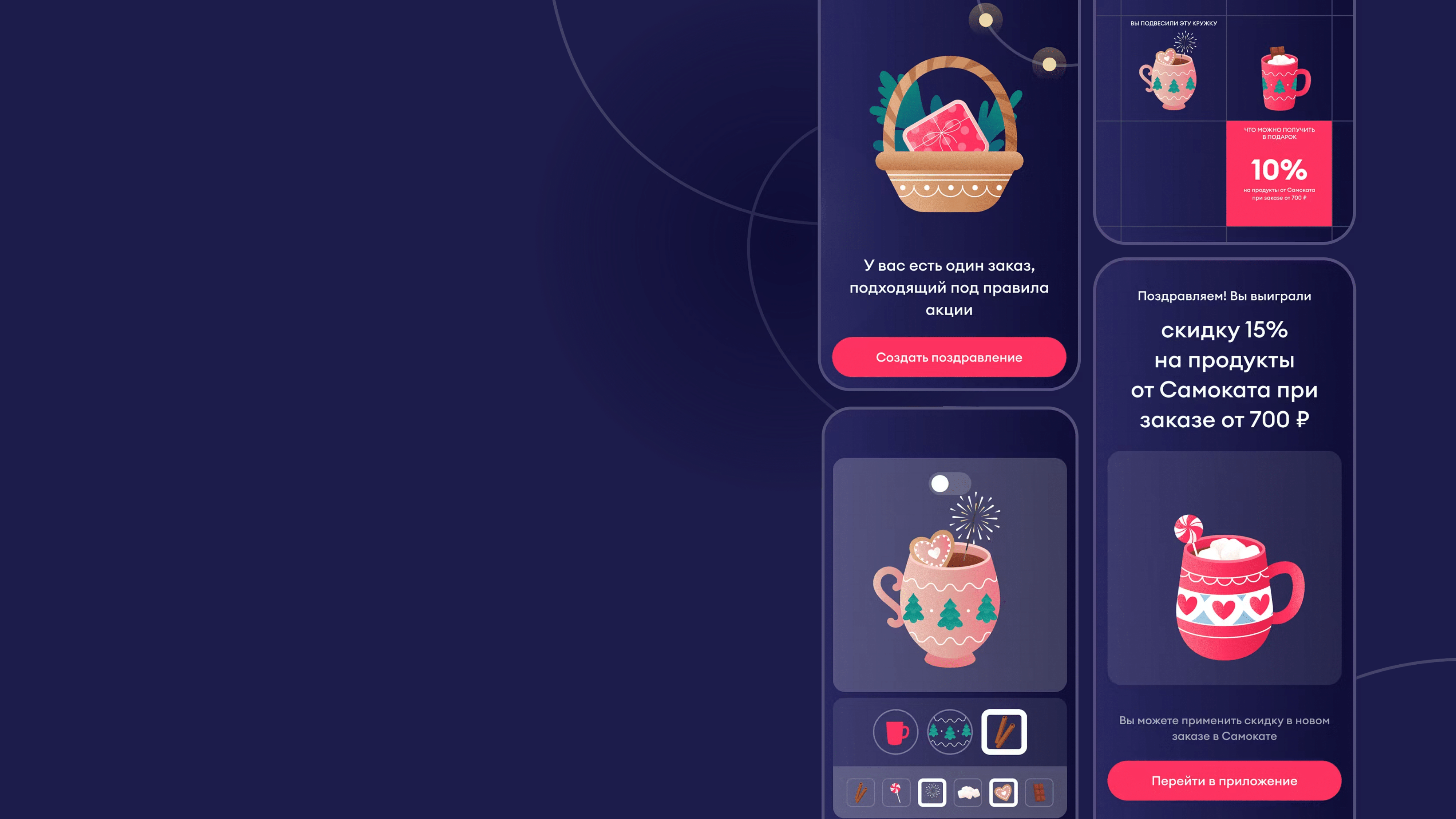 Создать лендинг и конструктор виртуальных кружек: новогодний спецпроект для Самоката с доброй концепцией «кофе для незнакомца». Цель проекта — повысить товарооборот собственной торговой марки.
