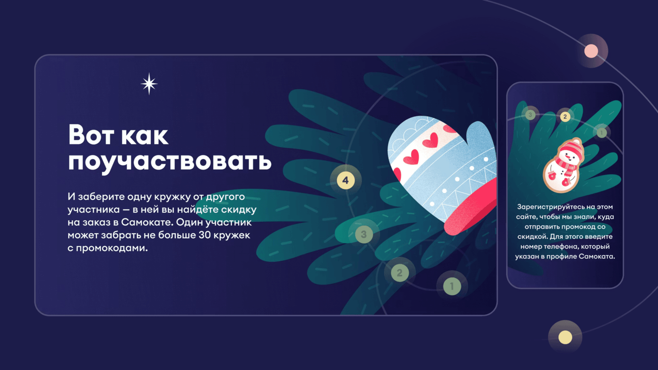 Результатом можно поделиться в социальных сетях, от этого фон кружки подсветится на общем фоне. Все «подвешенные» кружки располагаются на бесконечном полотне — ведь у Самоката миллионы покупателей, и каждый из желающих может оставить до 30 кружек. Кружка становится подарком — к ней прикрепляется случайный промо-код, который может забрать другой пользователь.