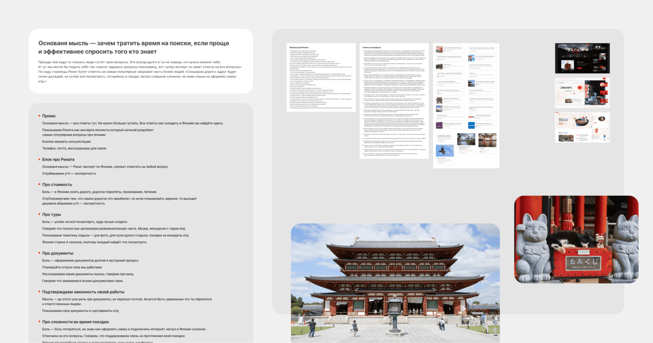 На первоначальном этапе нам было важно понять потребности целевой аудитории чтобы выделить ключевые элементы лендинга. Для этого мы пообщались с Ренатом, ведь кто лучше эксперта-востоковеда знает своих туристов? После интервью мы уже чётко понимали кто наши пользователи и какой функционал необходимо реализовать в лендинге.