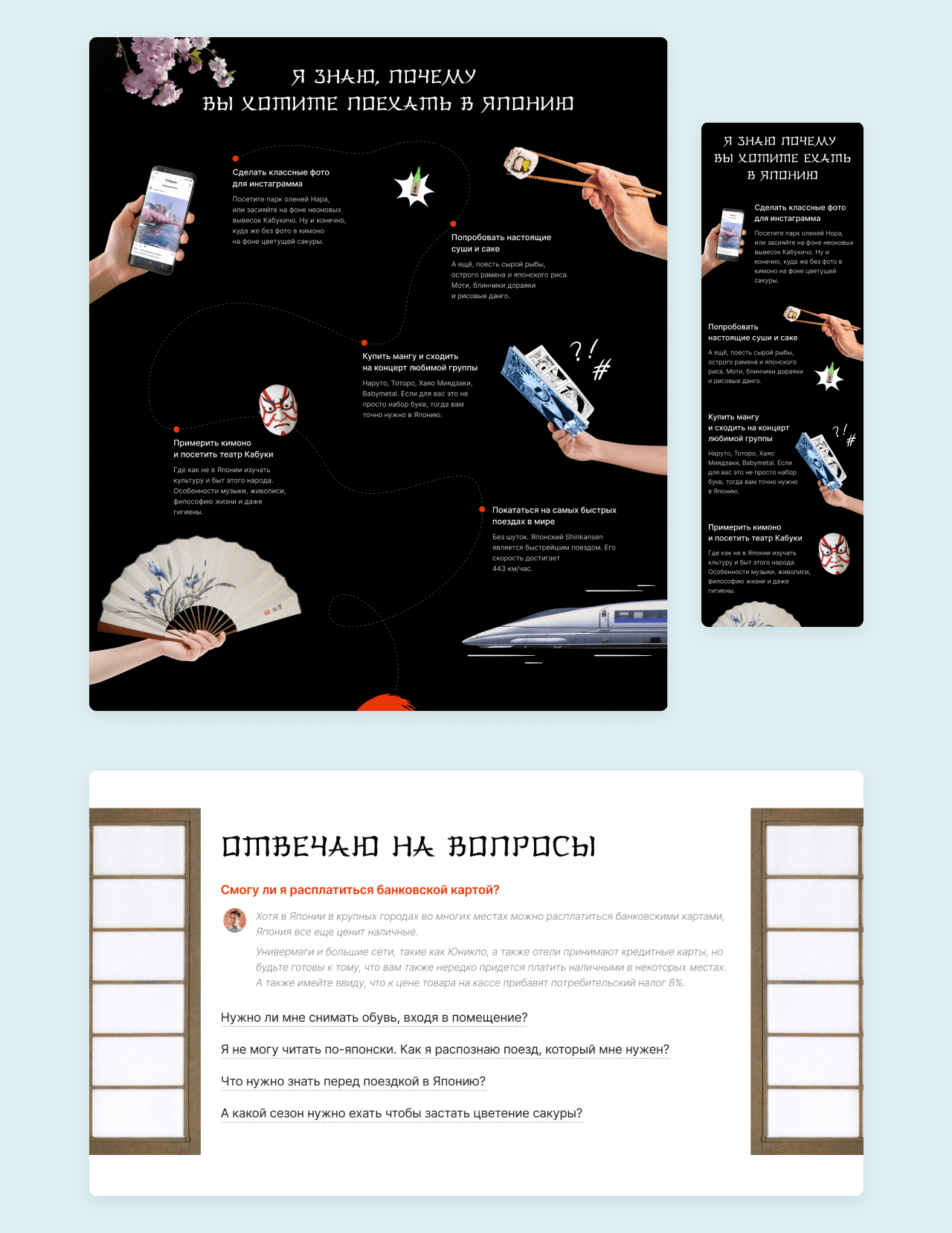 Весь контент, от текстов до визуалов, мы продумали так, чтобы максимально раскрыть тему Японии и экспертность нашего клиента.