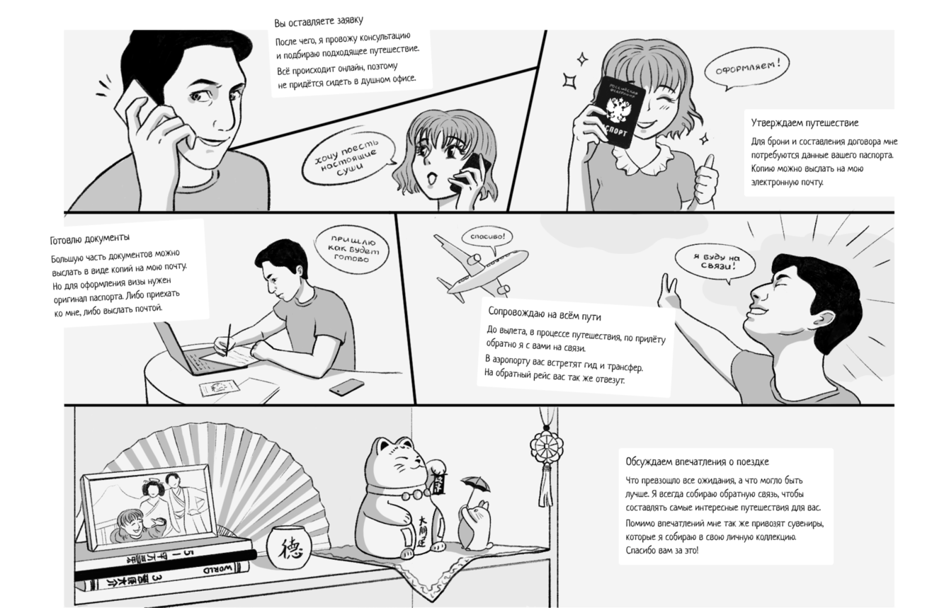 Самый творческий и любимый блок всей команды — комикс про оформление билета. Сложно представить Японию без аниме? Вот и нам было сложно представить стандартное оформление блока в карточки с цифрами.