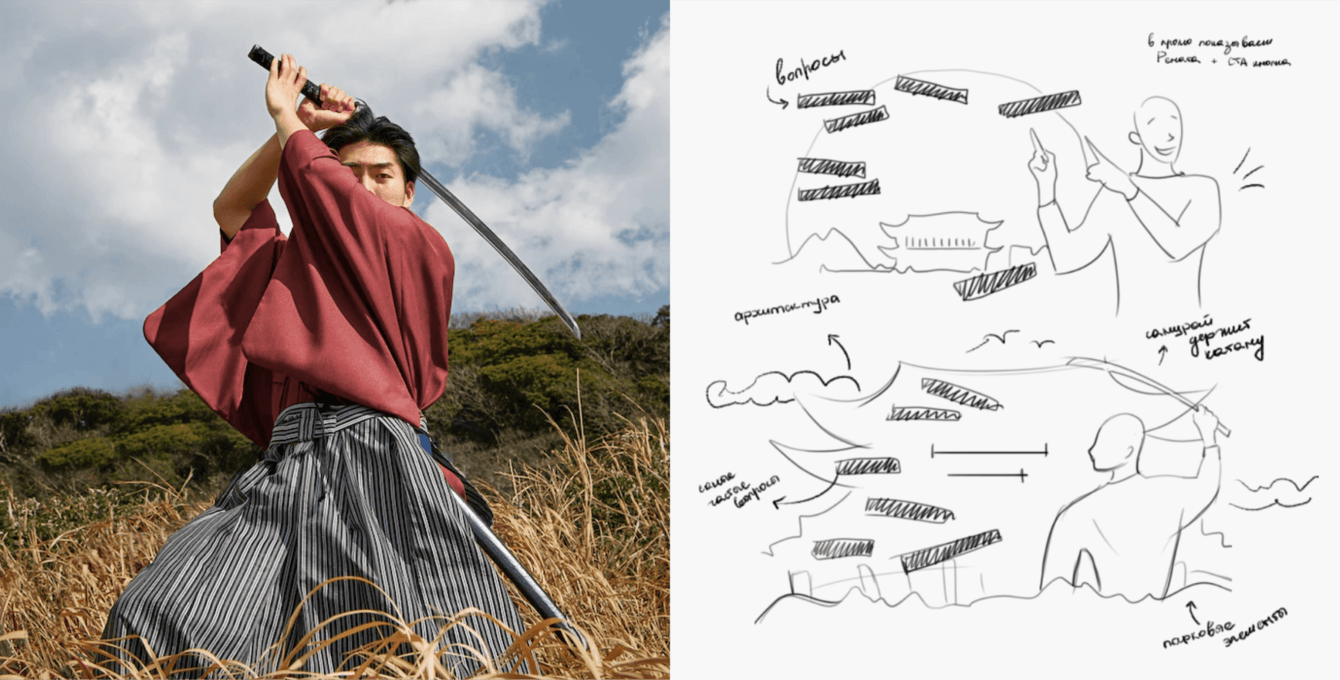 После первого этапа стало понятно, что ключевым героем лендинга будет сам Ренат, который проведёт пользователя через весь лендинг и будто сам расскажет о себе и своих услугах. Вся концепция началась с формирования первого экрана. По задумке на ней должен был появиться самурай, который взмахом катаны устраняет самые частые вопросы путешественников.