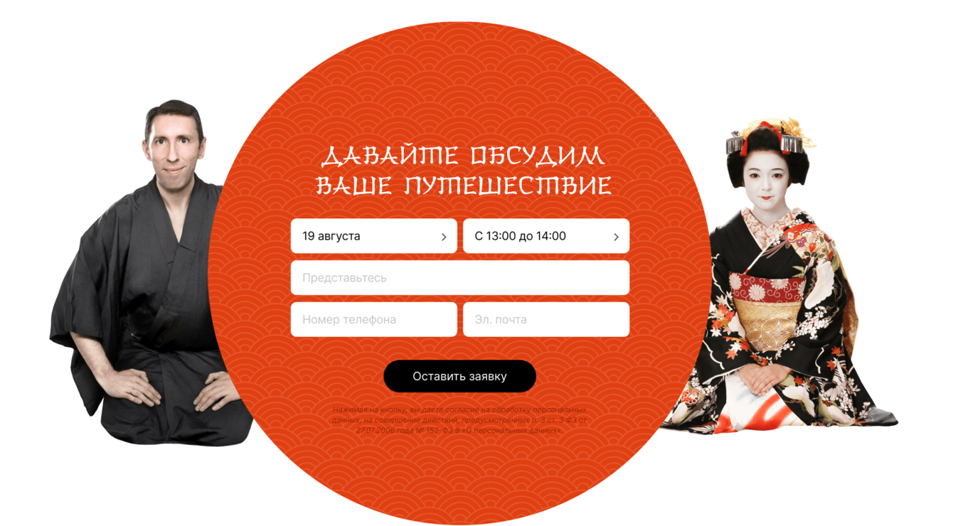 Мы создали эффектный, яркий лендинг известного эксперта по Японии Рената Камалова, который подробно рассказывает о туристических услугах и дает возможность записаться на консультацию. Благодаря контекстной рекламе лендинг полностью окупил себя за первые 2 месяца с момента запуска.