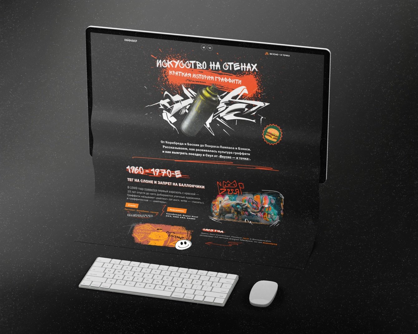 Нашей задачей было создание лендинга-таймлайна об истории граффити с интеграцией продукта, лендинг должен был передавать ощущение андеграунда, духа свободы и самовыражения.