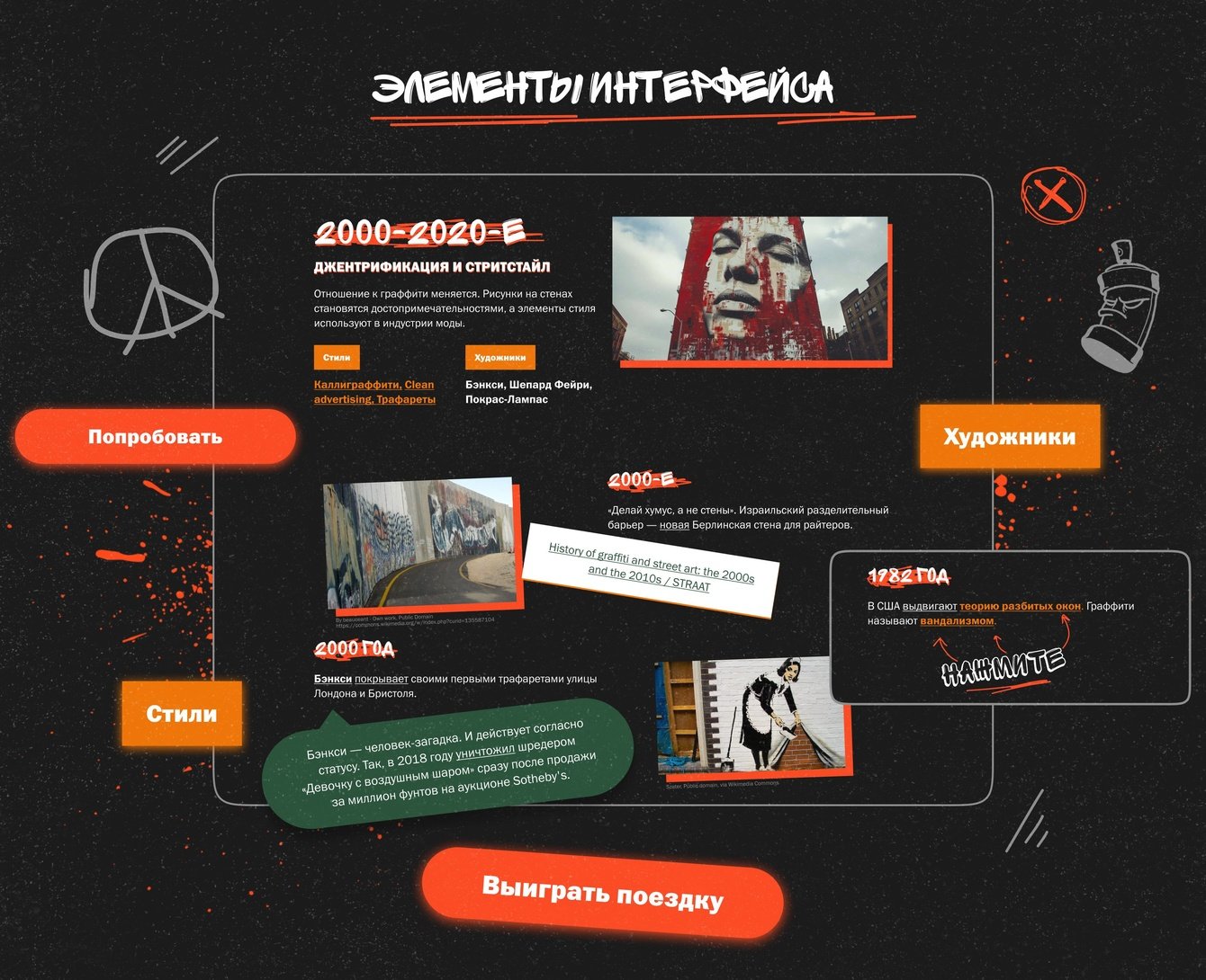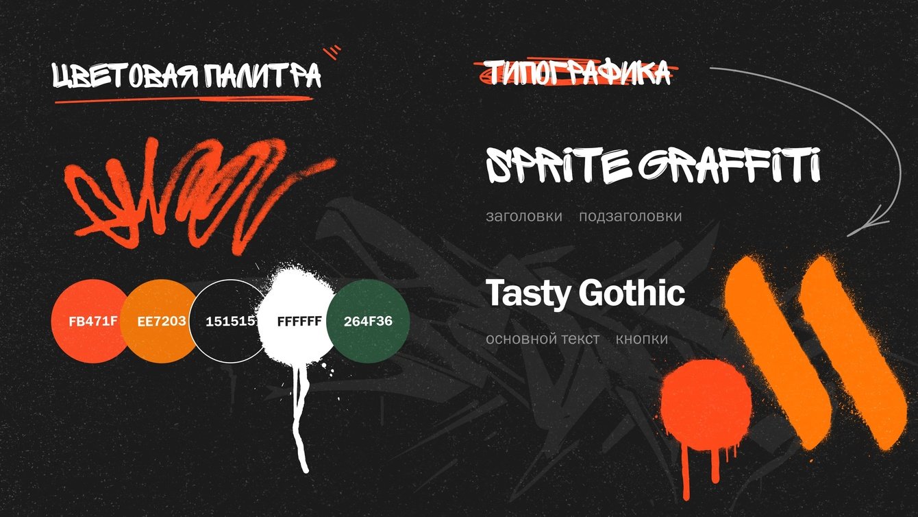 Граффити — это про яркость, свободу и самовыражение. Мы перевели эту энергию в язык цифрового дизайна, чтобы вдохновить пользователей и рассказать историю уличного искусства в интерактивном формате.