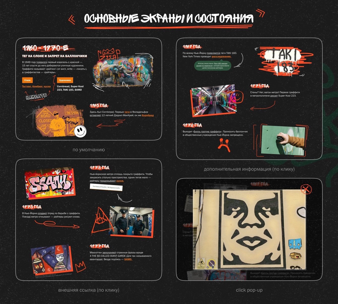 Пока наши коллеги из ЛФ готовили текст, старший дизайнер на основе черновика подбирал контент и готовил прототип. Важно было уместить всю информацию на одной странице, а также продумать фичи для лёгкого восприятия контента. Несмотря на андеграундность проекта, он в полной мере должен был раскрыть тему истории граффити, и при этом не стать скучным и перегруженным.