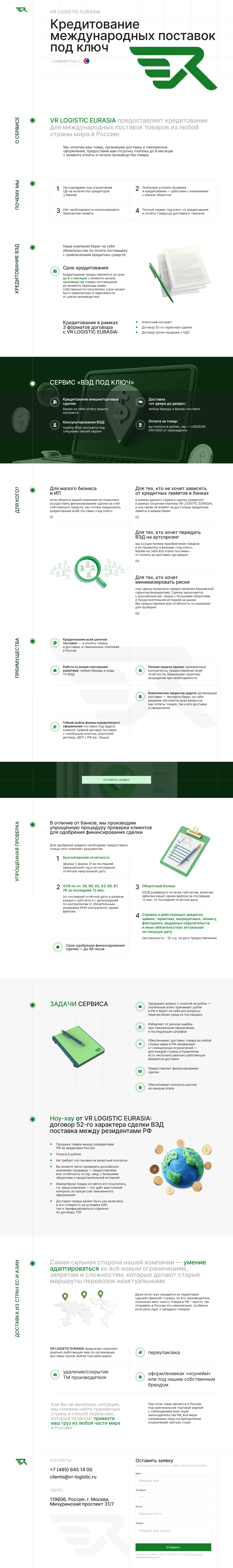 – Реализованы ключевые блоки: «Проблема международных расчётов», «Решение от VR Logistic», «Юридическая схема», «Как это работает», «Преимущества», «FAQ», «Форма заявки».