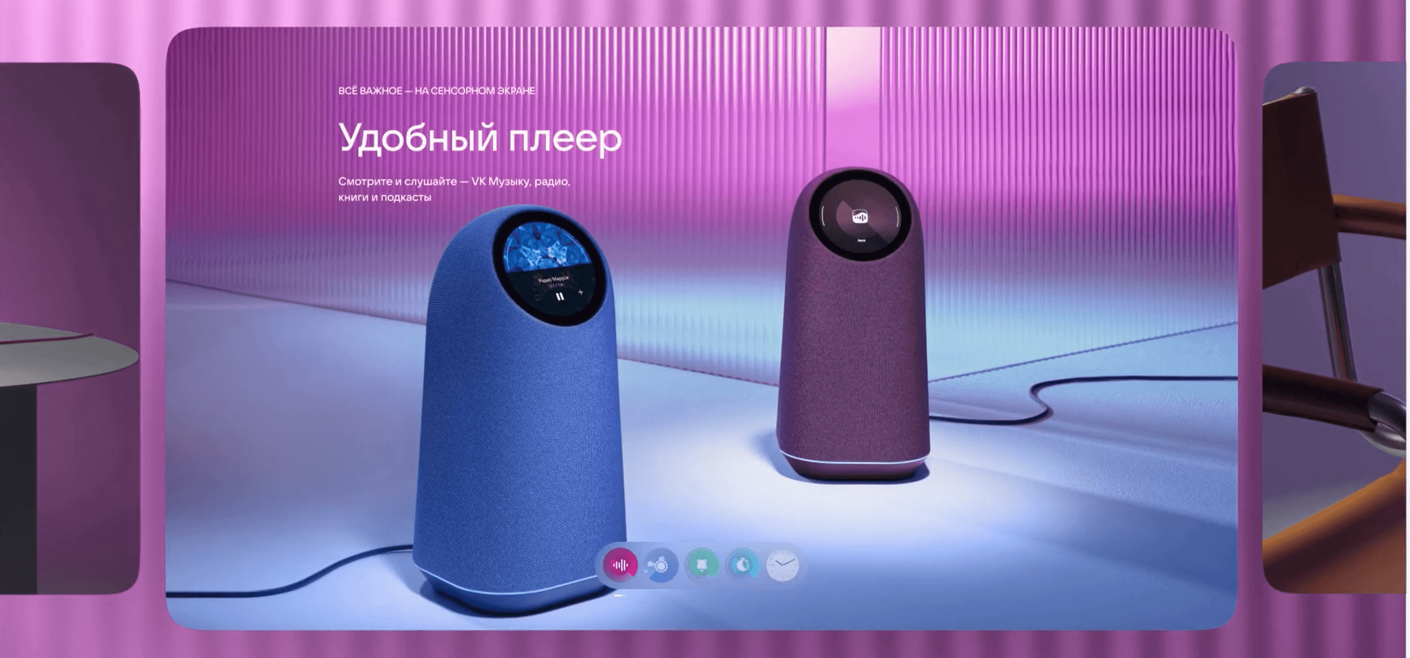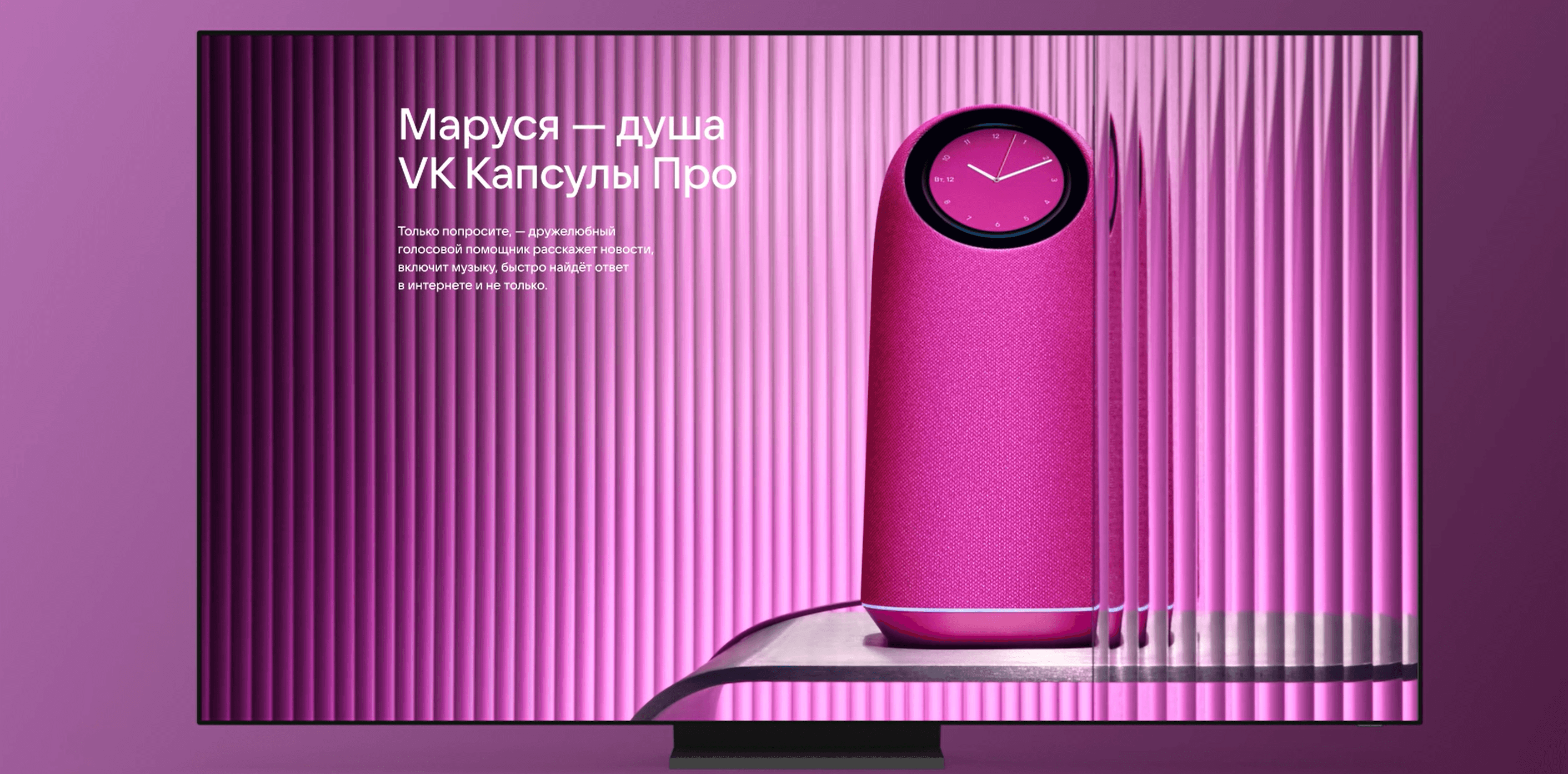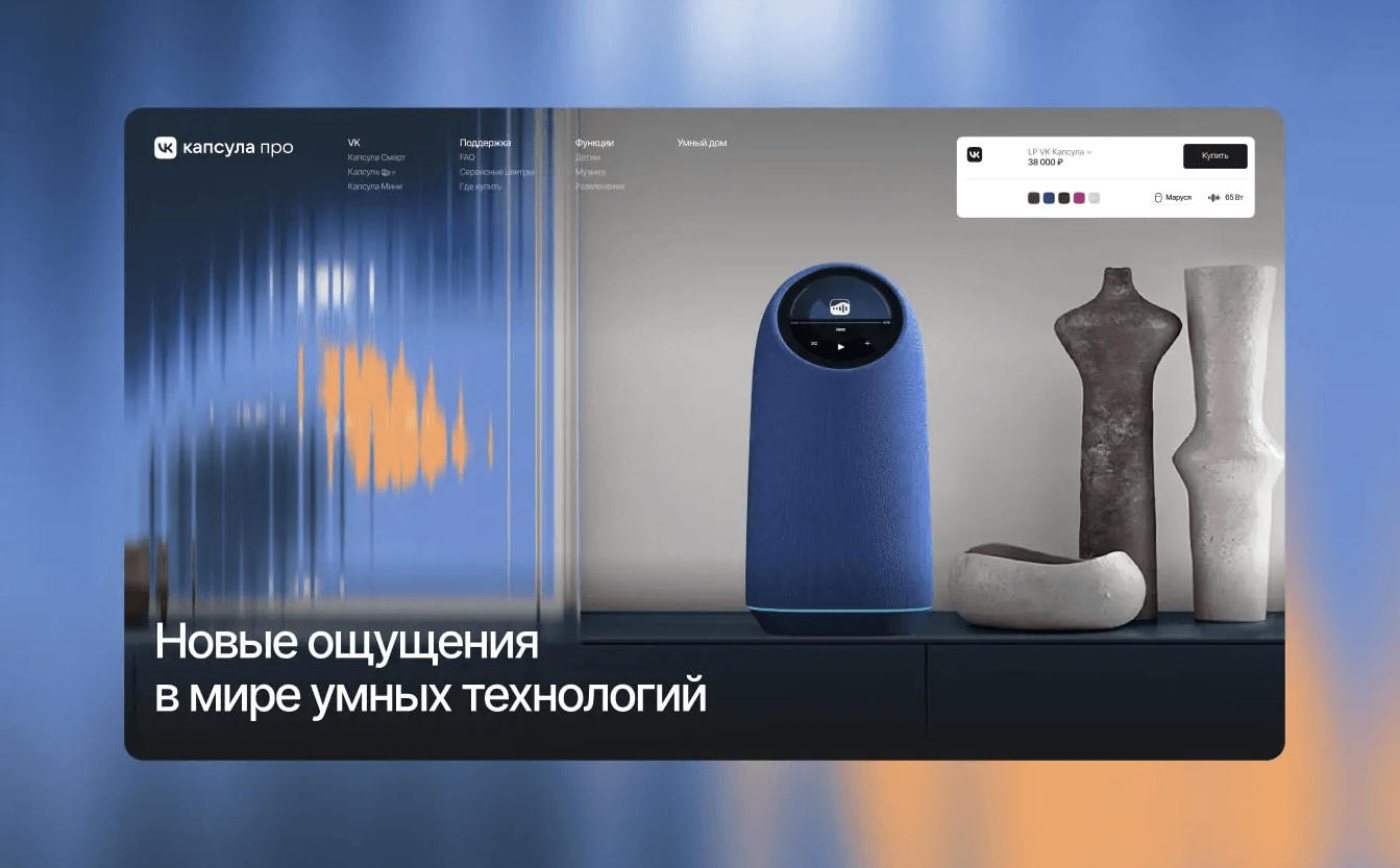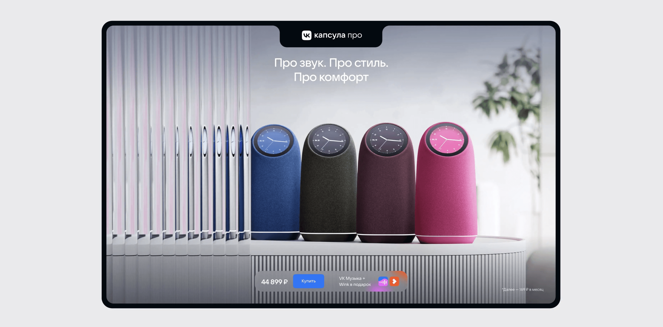 VK Капсула Про — флагманская умная колонка VK с кастомным сенсорным экраном, объемным звуком и умными датчиками внутри. Дизайн устройства разработал Карим Рашид, любитель цвета, гибких форм и футуристичности.