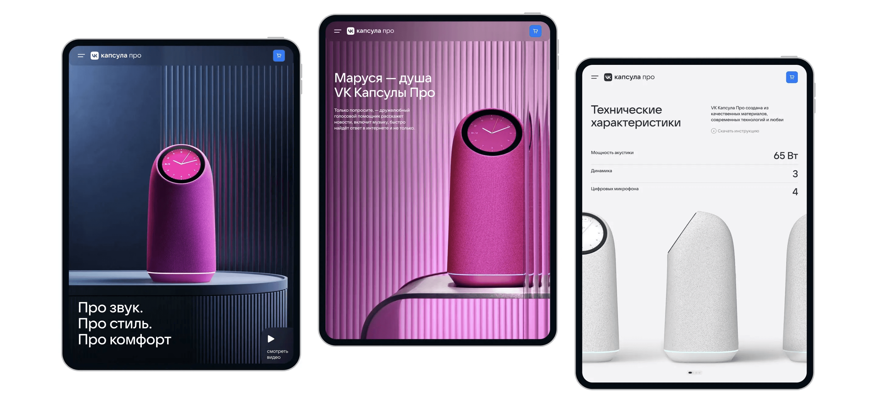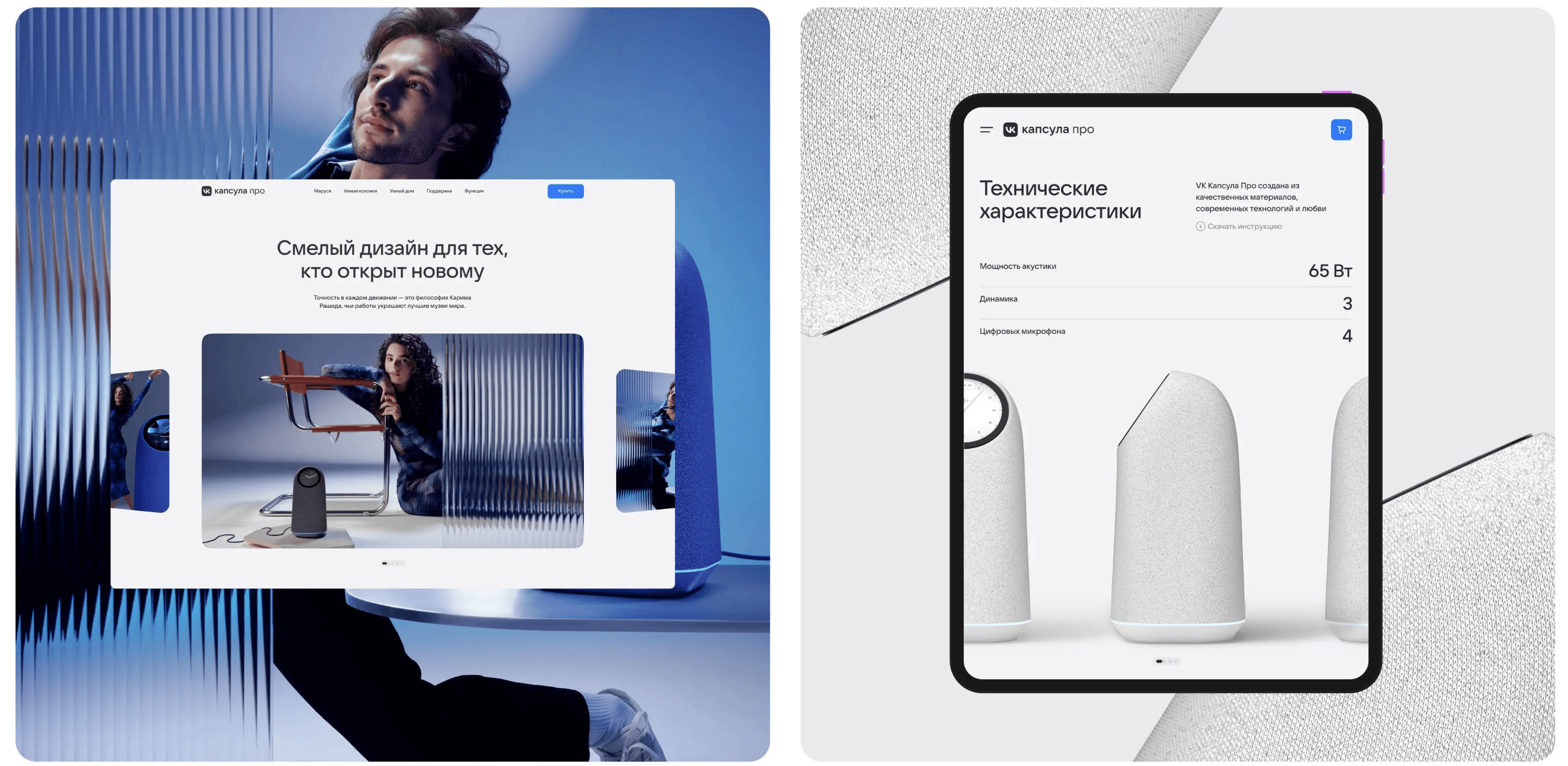 Создавая смелый интерфейс, мы не забыли про то, что лендинг должен встроиться в действующий сайт VK о колонках — применили существующую сетку и адаптировали меню.