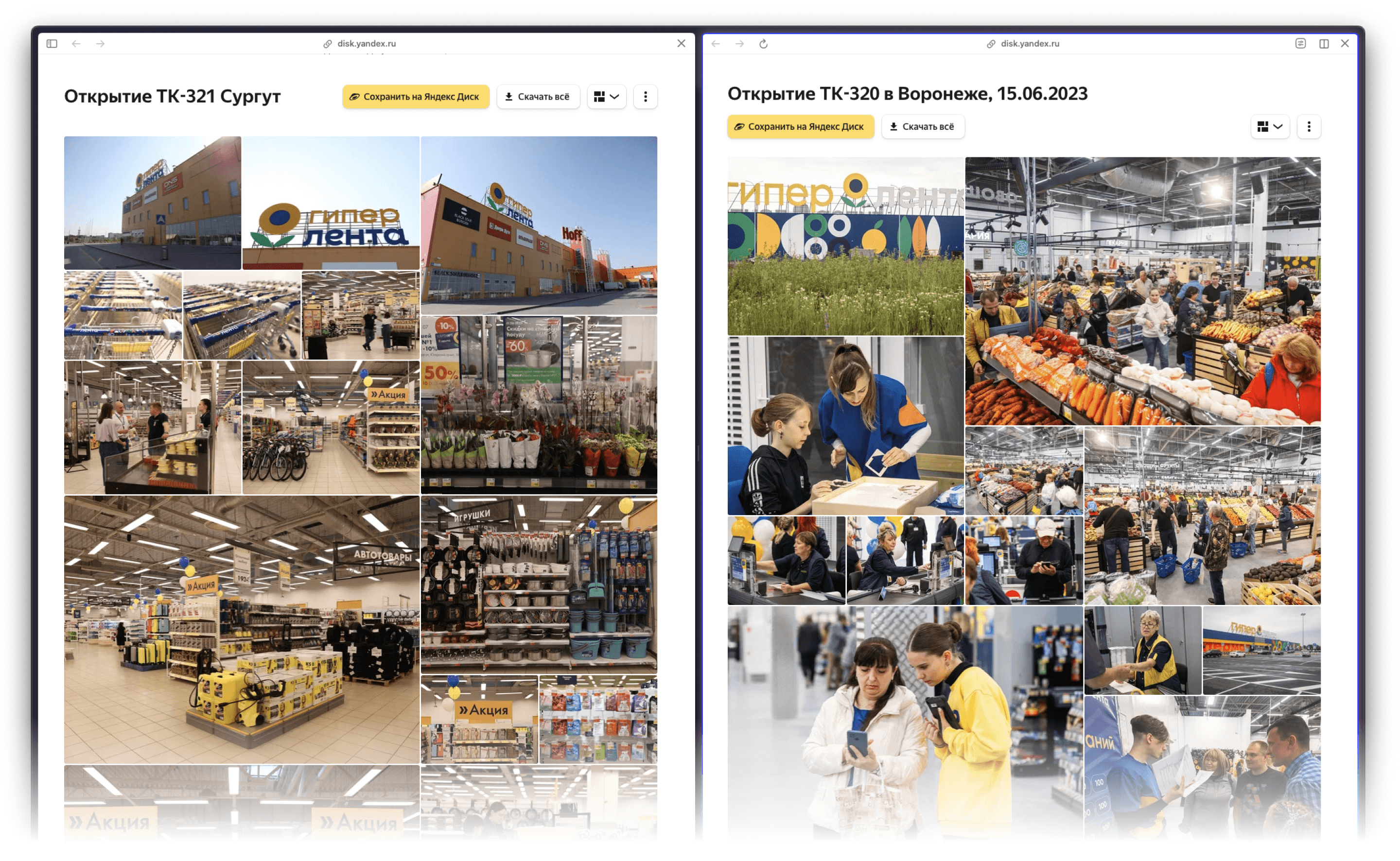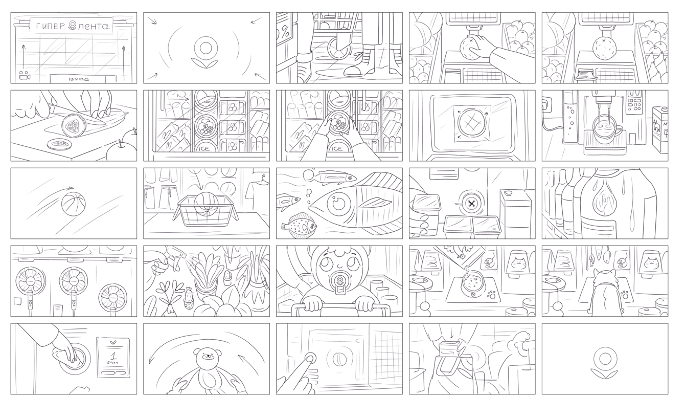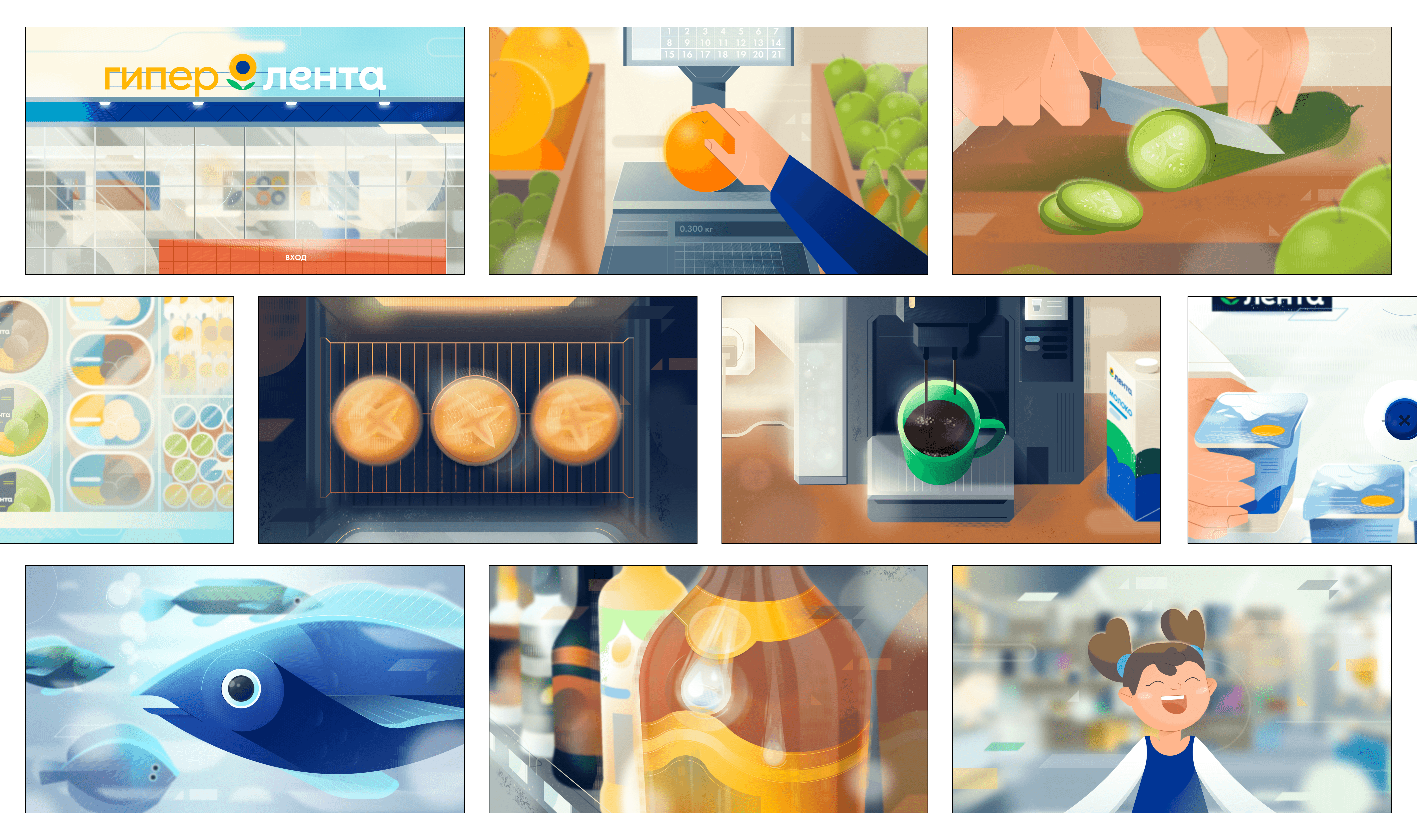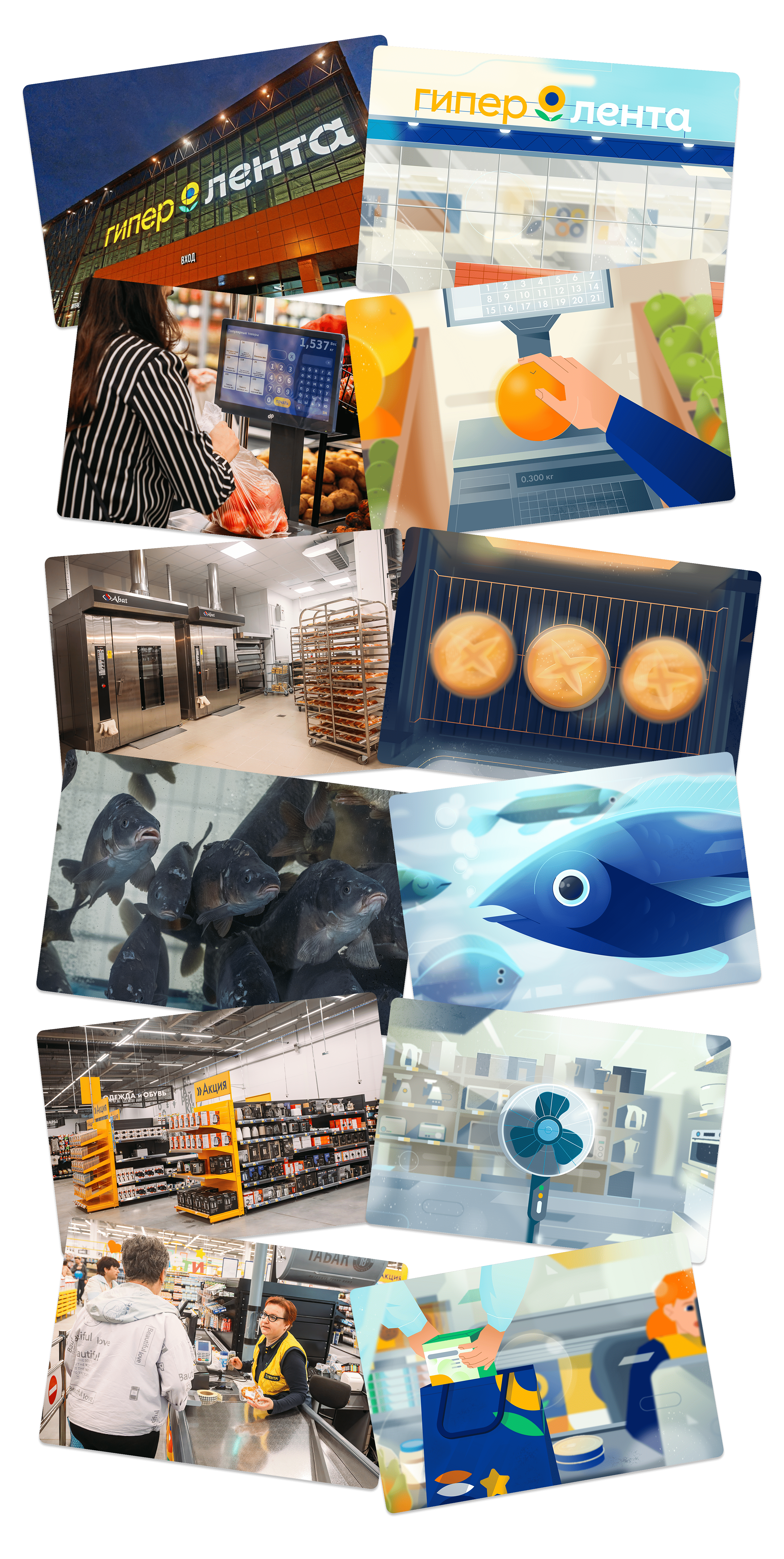 Чтобы лучше понимать наполнение «Ленты» разных отделов вне зависимости от города, ориентировались на большую базу фотографий из гипермаркетов в Воронеже и Сургуте. Эти же фотографии пригодились при создании раскадровки и чистовых иллюстраций.