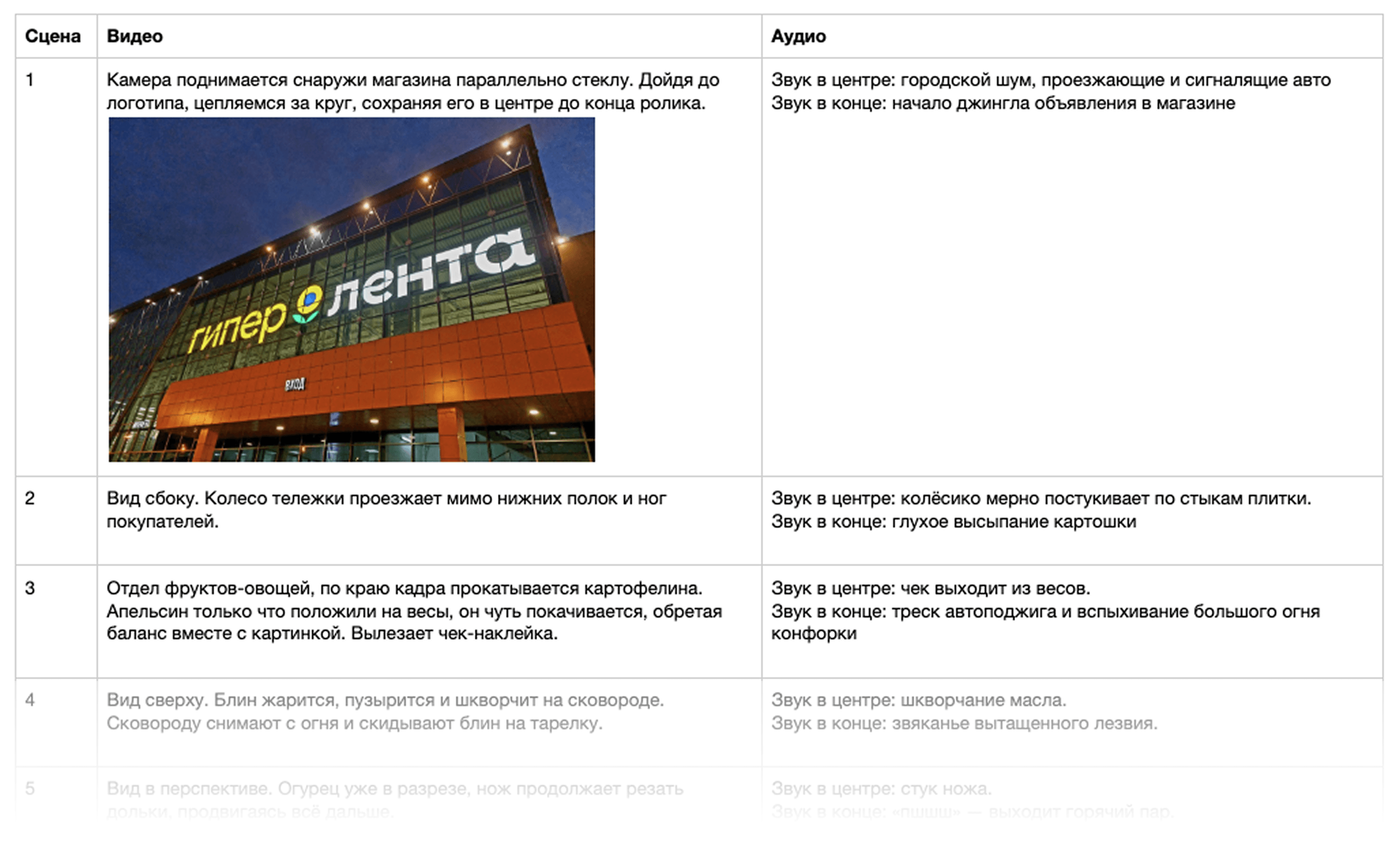 После утверждения концепции мы перешли к написанию сценария. В нём описали, что происходит внутри кадра и какой фоновый звук будет сопровождать сцену.