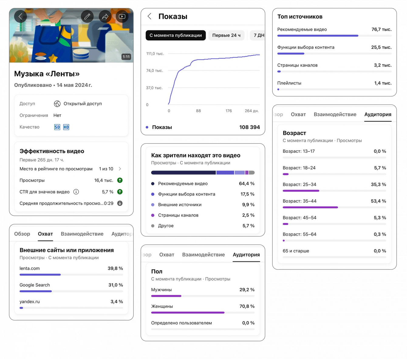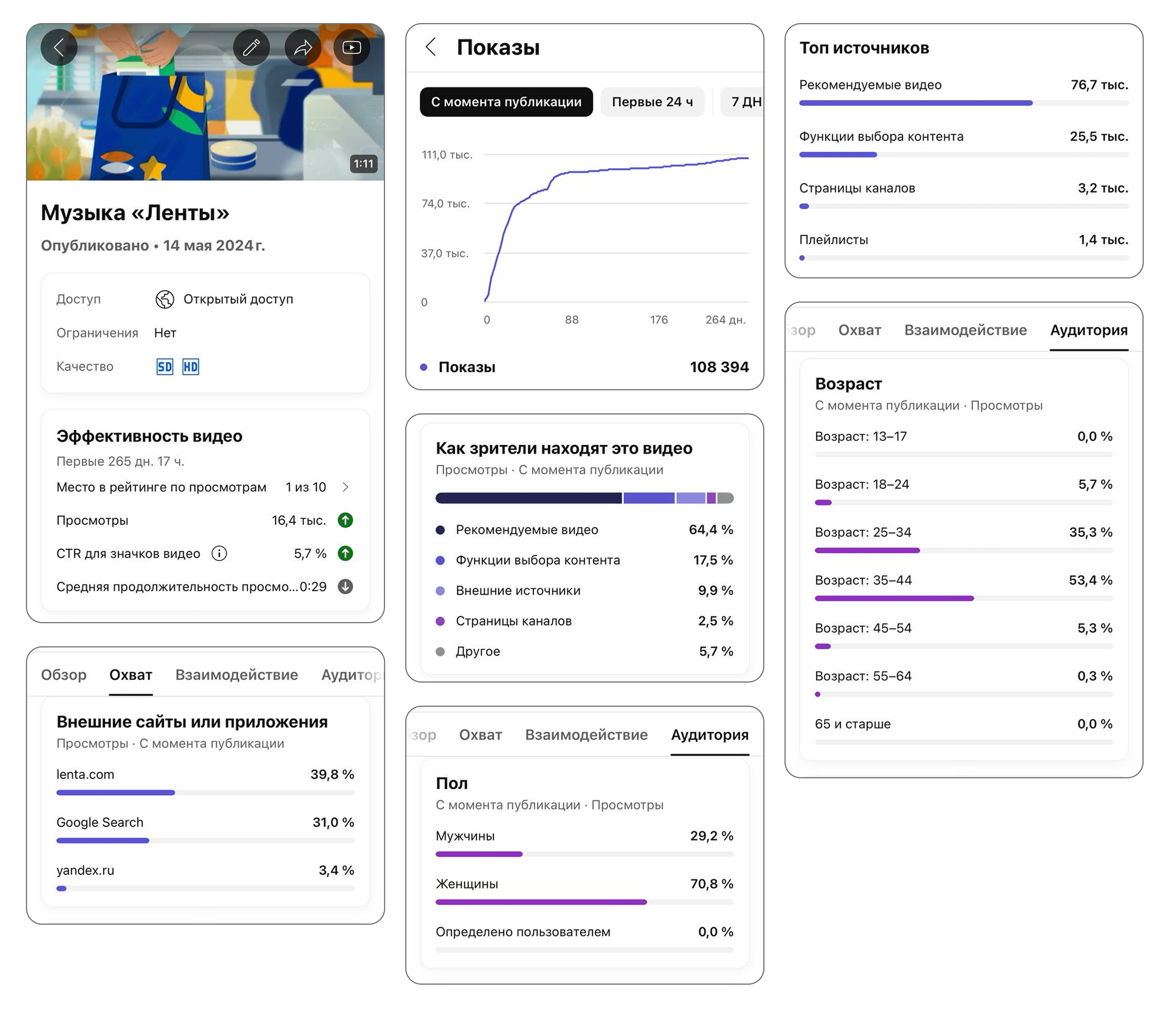 В скриншотах ниже статистика ролика из Ютуба по эффективности, показам, источникам, охватам и зрителям.