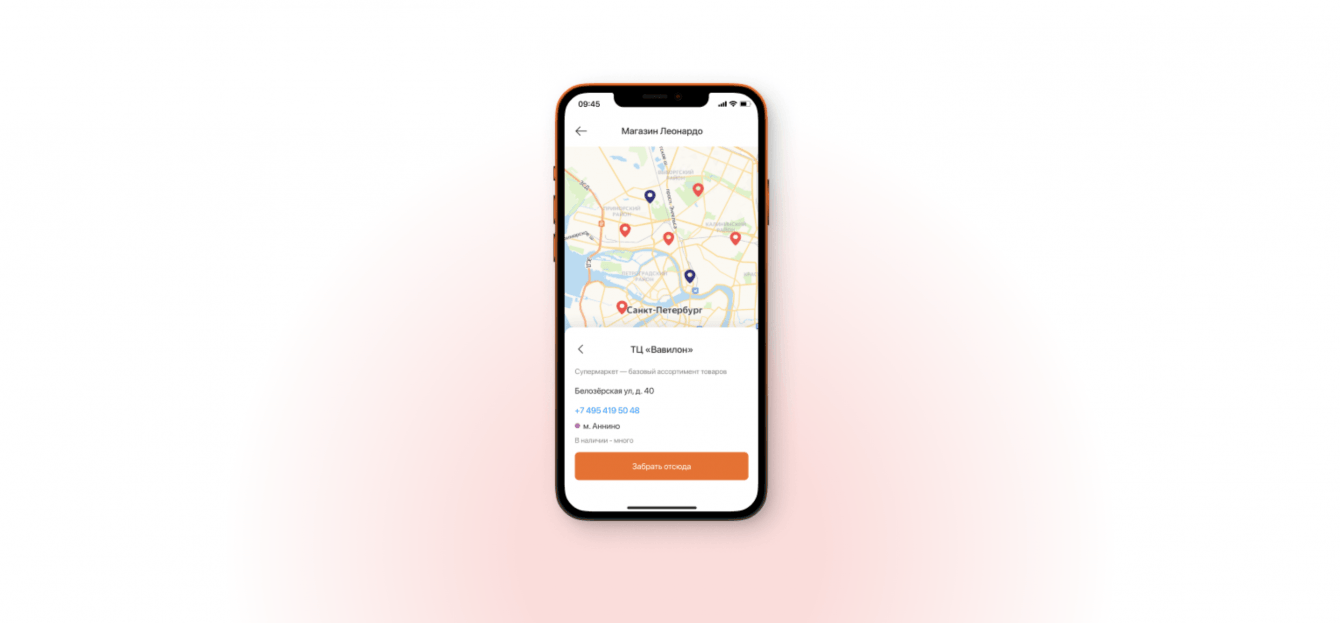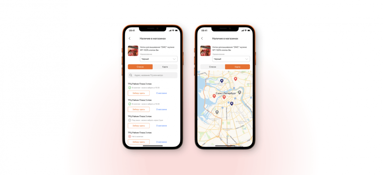 На случай, если нужного товара нет в выбранном магазине, мы реализовали простой и удобный интерфейс для поиска магазина, где товар есть в наличии. Искать можно по списку или на карте.