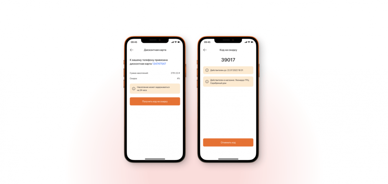 Участники системы лояльности могут получать скидки на покупки в офлайн-магазинах через приложение. Для этого мы подключили возможность привязки дисконтной карты к профилю пользователя и генерации уникальных скидочных кодов.