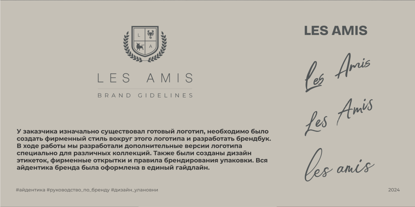 У заказчика изначально существовал готовый логотип, необходимо было создать фирменный стиль вокруг этого логотипа и разработать брендбук. В ходе работы мы разработали дополнительные версии логотипа специально для различных коллекций. Также были созданы дизайн этикеток, фирменные открытки и правила брендирования упаковки. Вся айдентика бренда была оформлена в единый гайдлайн.