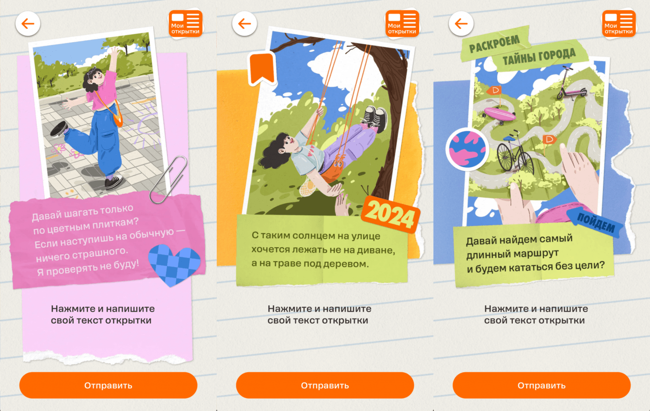 Сама акция "Лето в городе" задумана в формате адвент-календаря - не праздничного, а летнего. Каждый день, заходя в приложение Додо пиццы, пользователь открывает для себя новые открытки, посвященные летним впечатлениям. Эти диджитал-открытки можно самостоятельно дополнить любой надписью и отправить друзьям и близким прямо из приложения.