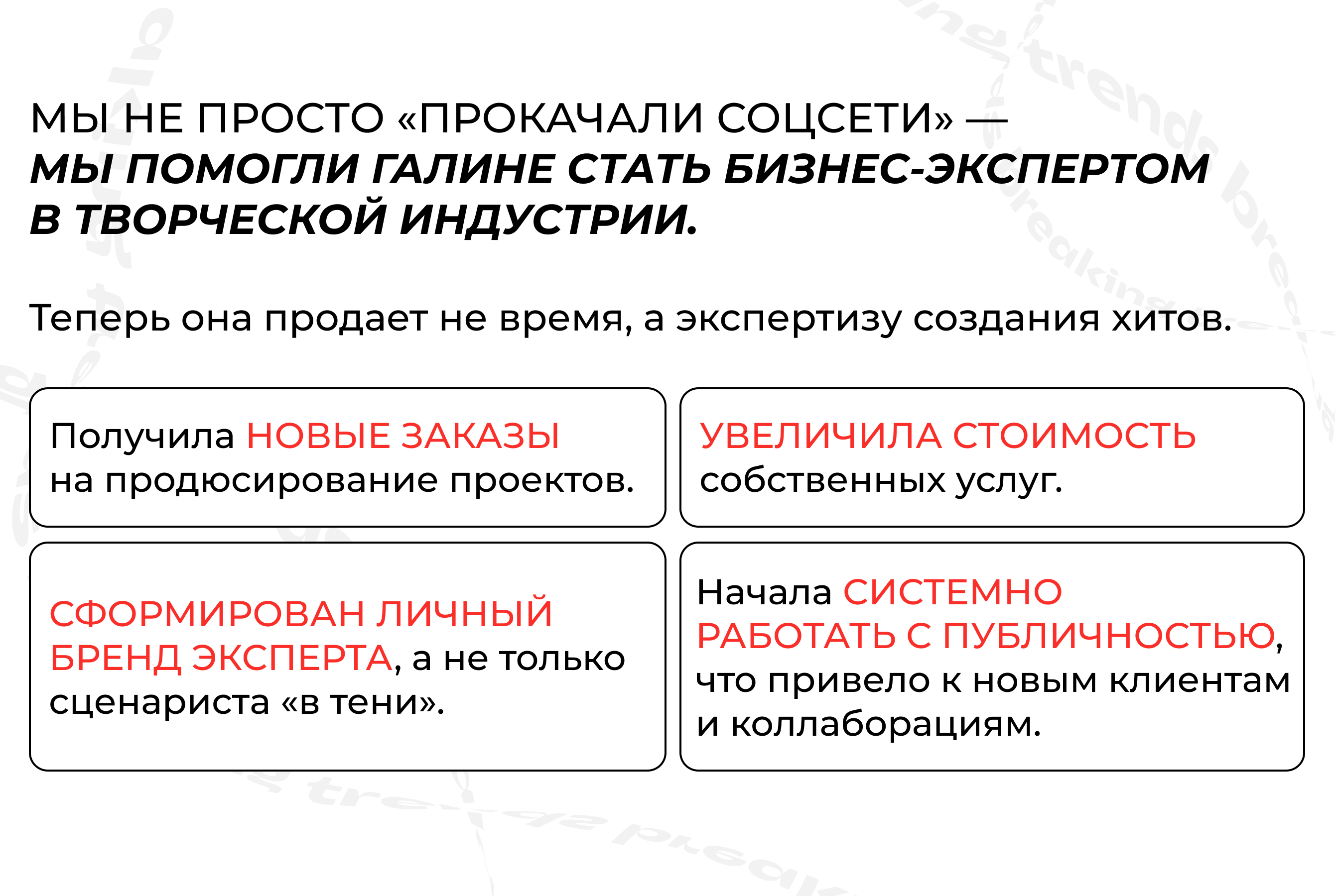 Мы не просто «прокачали соцсети» — мы помогли Галине стать бизнес-экспертом в творческой индустрии. Теперь она продает не время, а экспертизу создания хитов.