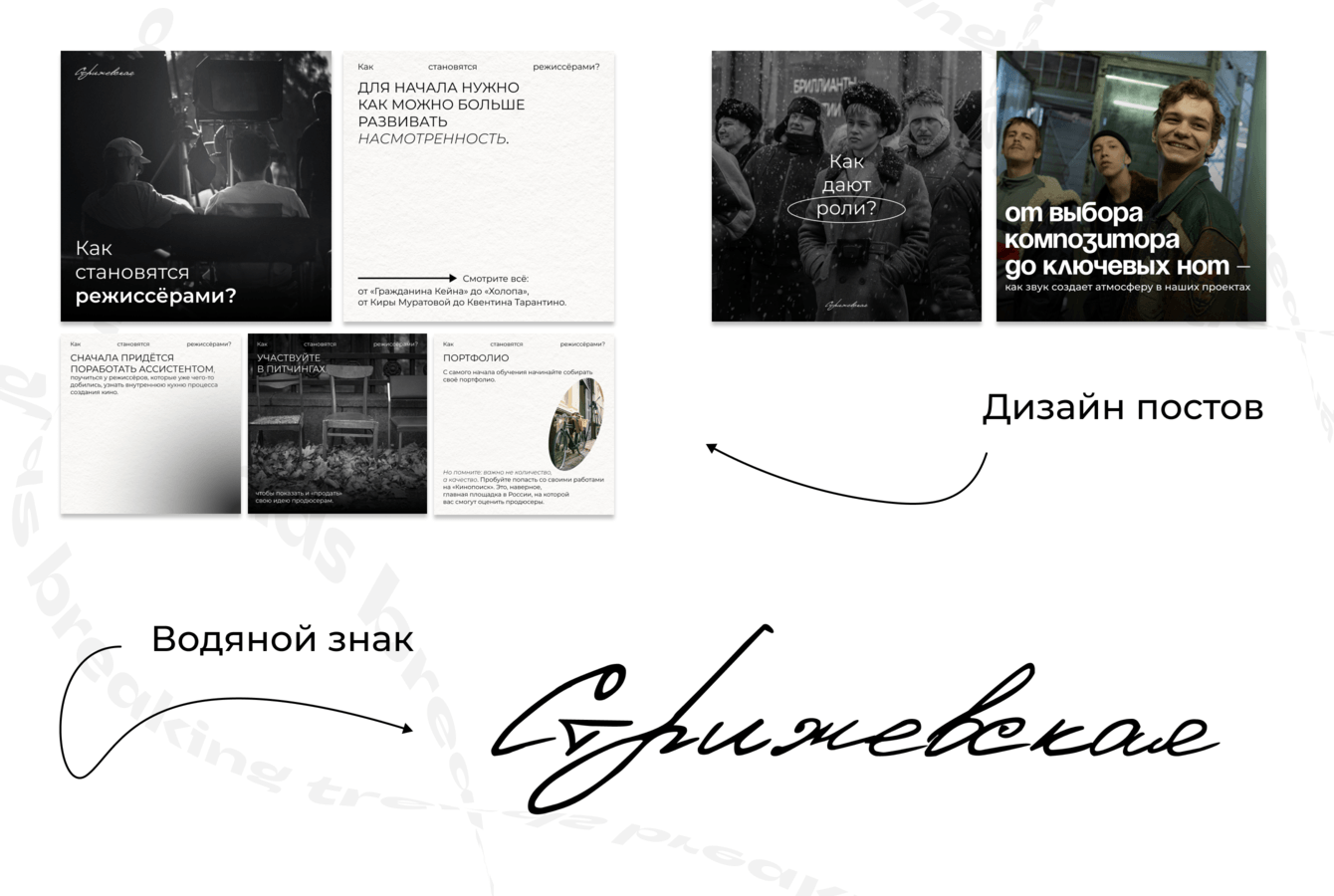 Еще одна фишка визуала – водный знак, представляющий собой рукописное написание фамилии. Так контент выглядит дорого, он выдержан в едином стиле и носит отпечаток экспертности и креатива.