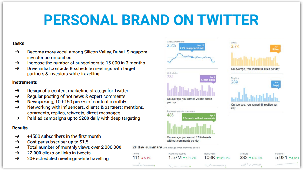 Проект по продвижению Твиттер-аккаунта основателя стартапа с целью утверждения его статуса ведущего эксперта в выбранной области.