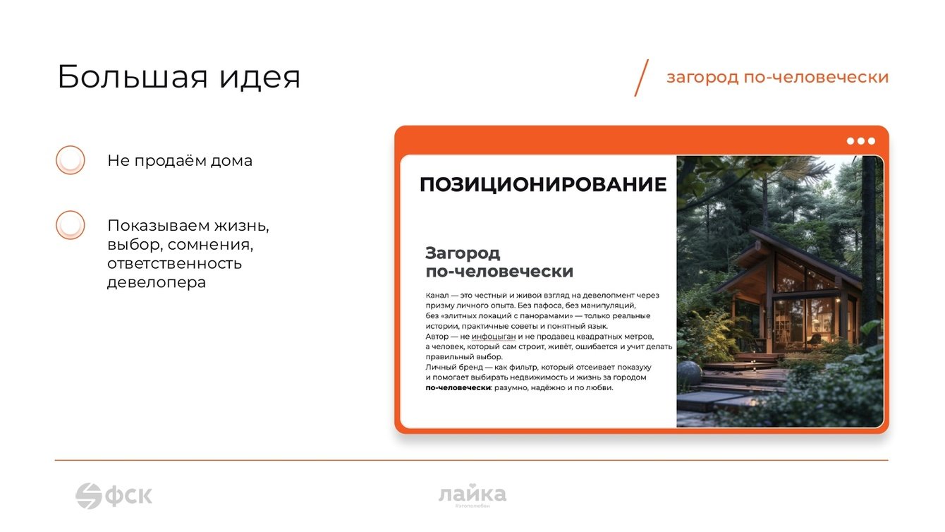 Мы не продаём в лоб, не говорим языком пресс-службы и не заискиваем перед покупателем. Мы обращаемся от лица живого человека его словами, рассказывая о его жизни, значительную роль в которой играет загородная недвижимость.