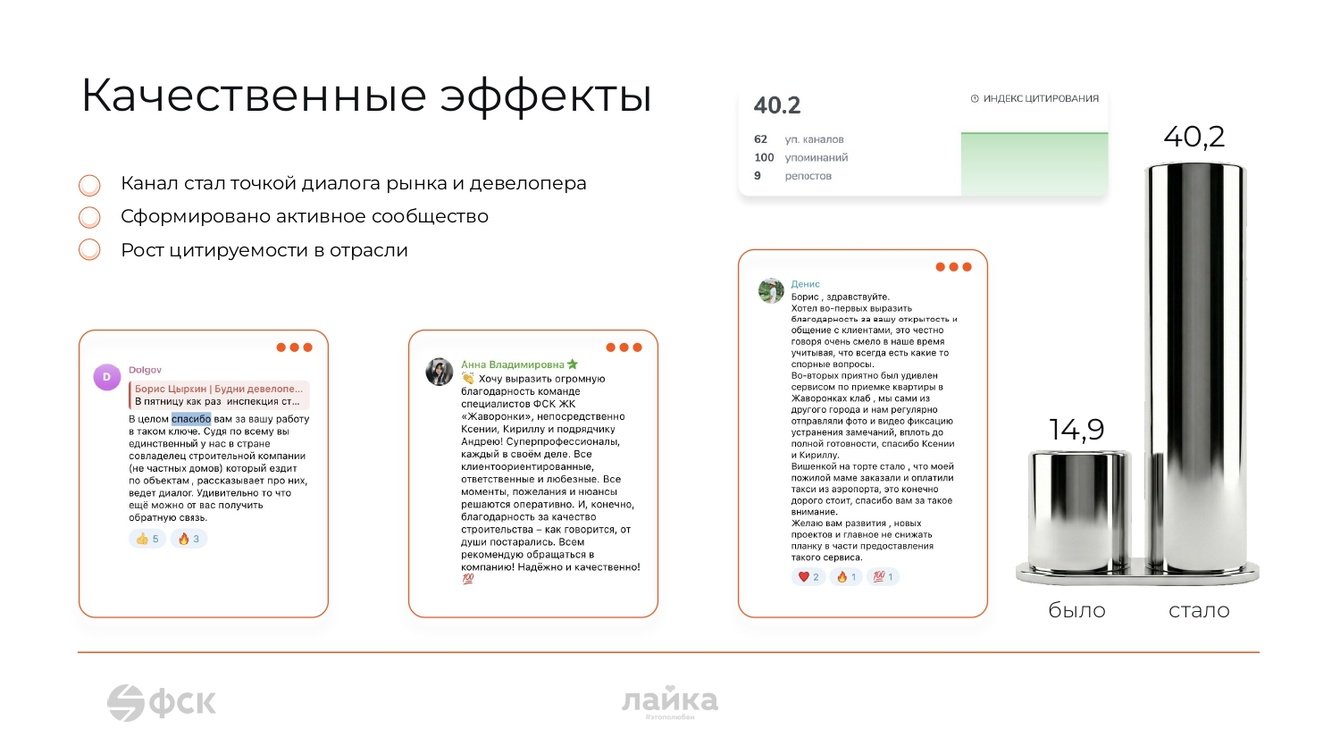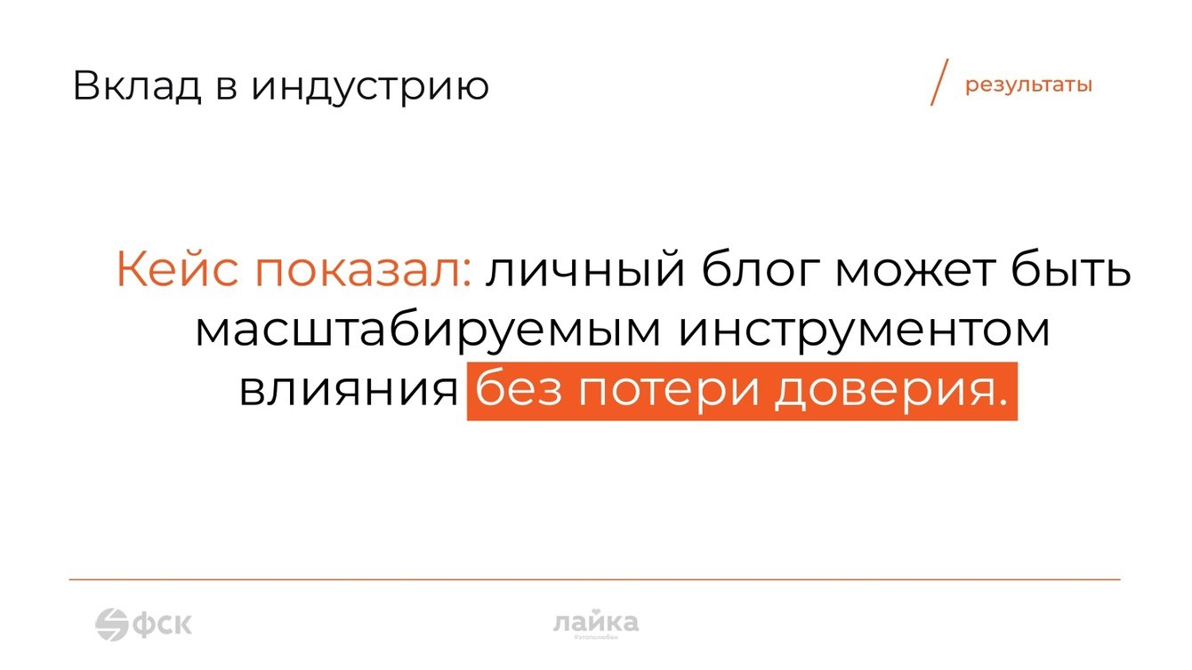Это решение было оптимальным, потому что оно напрямую решало главный парадокс: как расти, не теряя аутентичности. Стратегия позволила сохранить живой, непостановочный тон и личную ответственность как основу доверия, но при этом привнести структуру, регулярность и профессиональное качество в подачу. Каждый пост, даже на отраслевую тему, теперь звучит как часть честного разговора, а не как корпоративный релиз. Это превратило канал в уникальный медиапродукт, который конкурировал не с другими блогами, а с самим барьером недоверия на рынке.