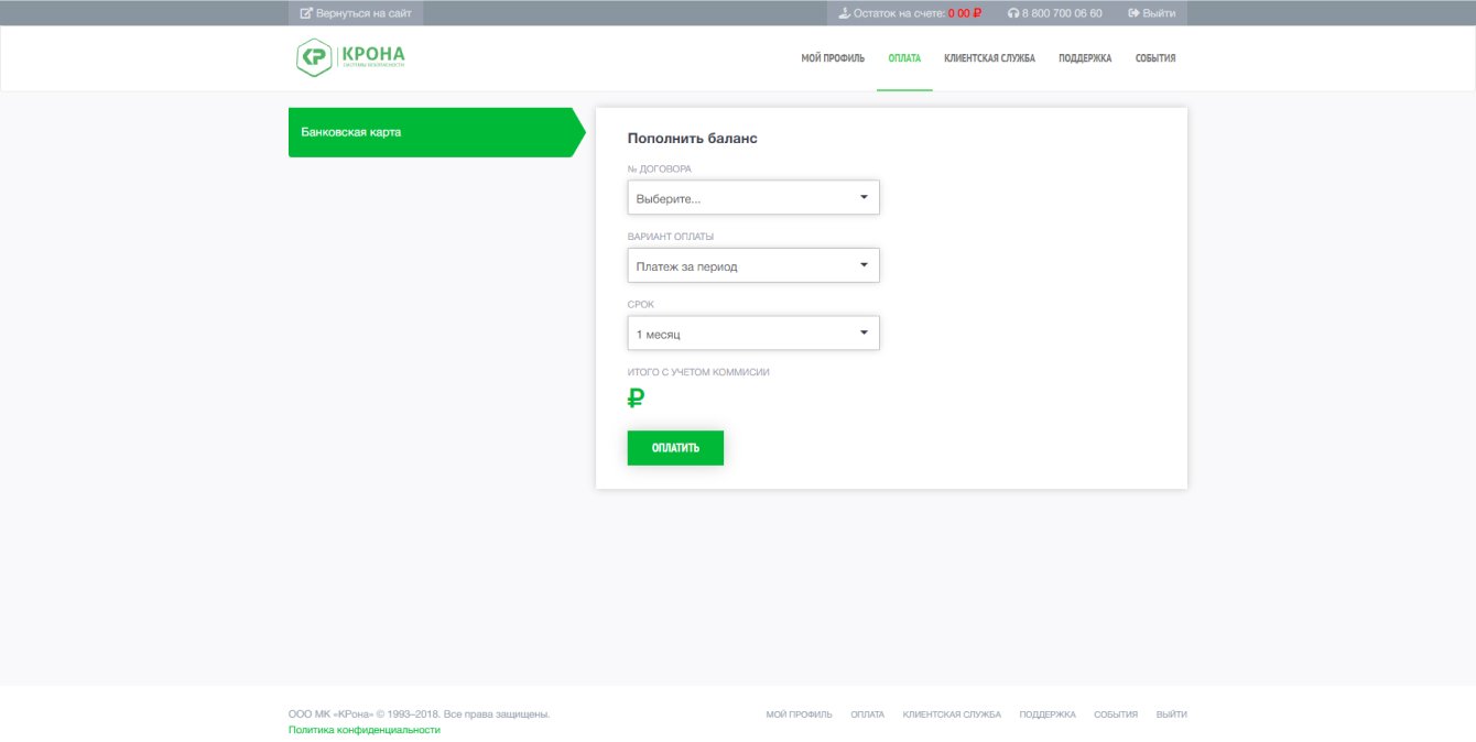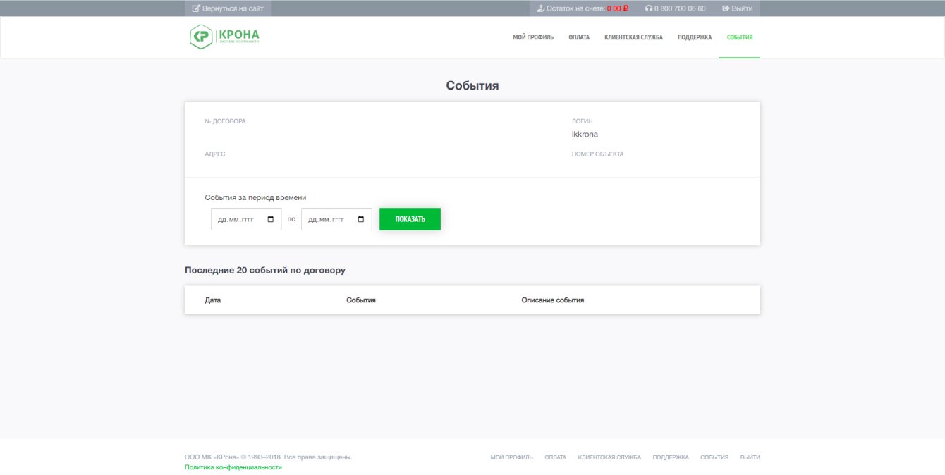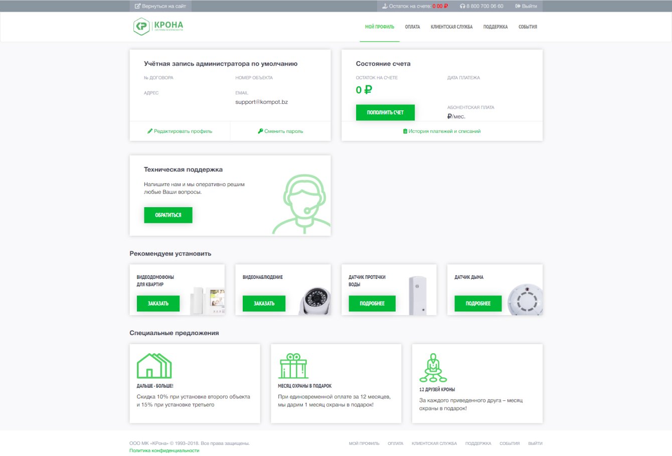 Личный кабинет выполняет сервисную функцию и позволяет клиентам охранной компании получать актуальную информацию о состоянии своих объектов, пополнять баланс, связываться со службой технической поддержки