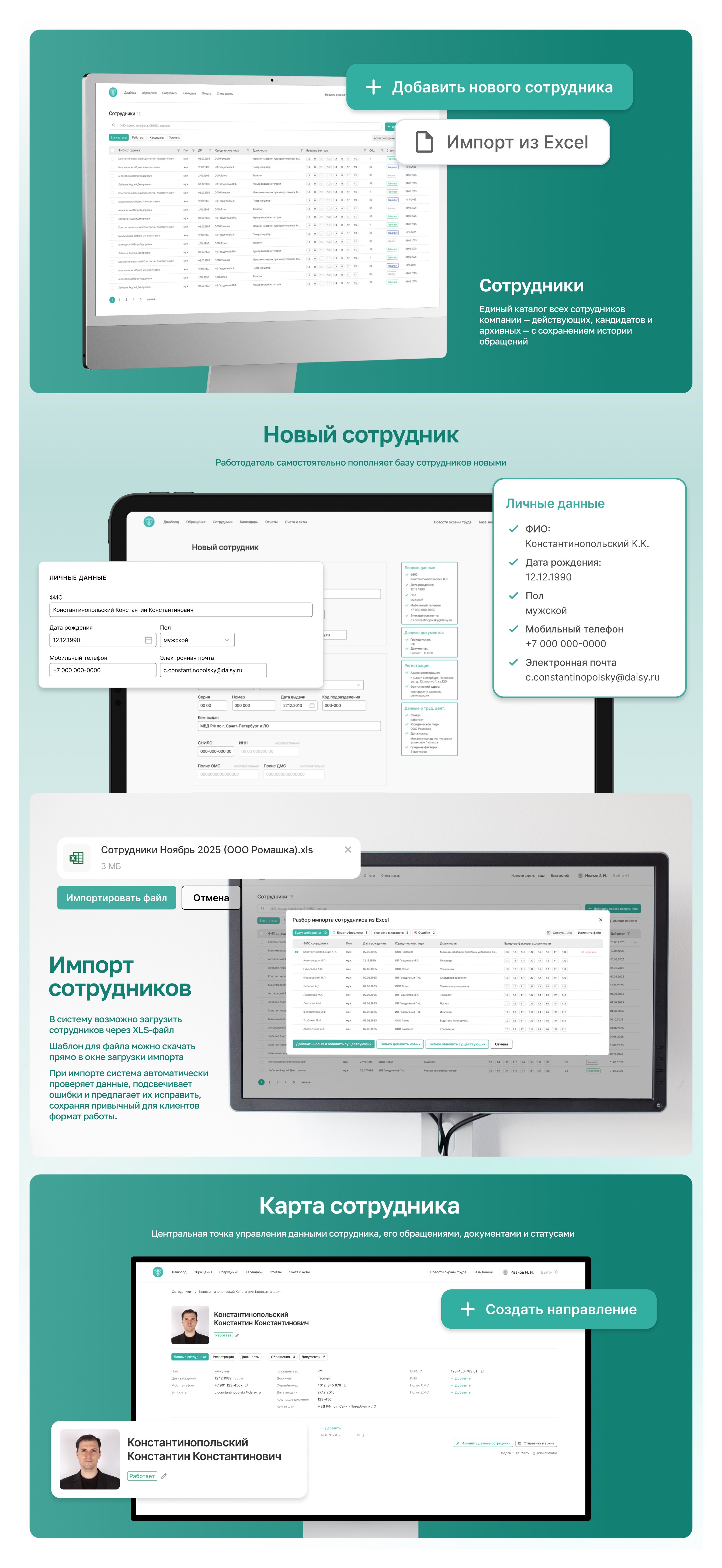 Сотрудников можно добавлять не только вручную, но и массово — через загрузку Excel-файла. Такой функционал привычен клиентам медцентра и помогает легче работать с большими списками сотрудников.