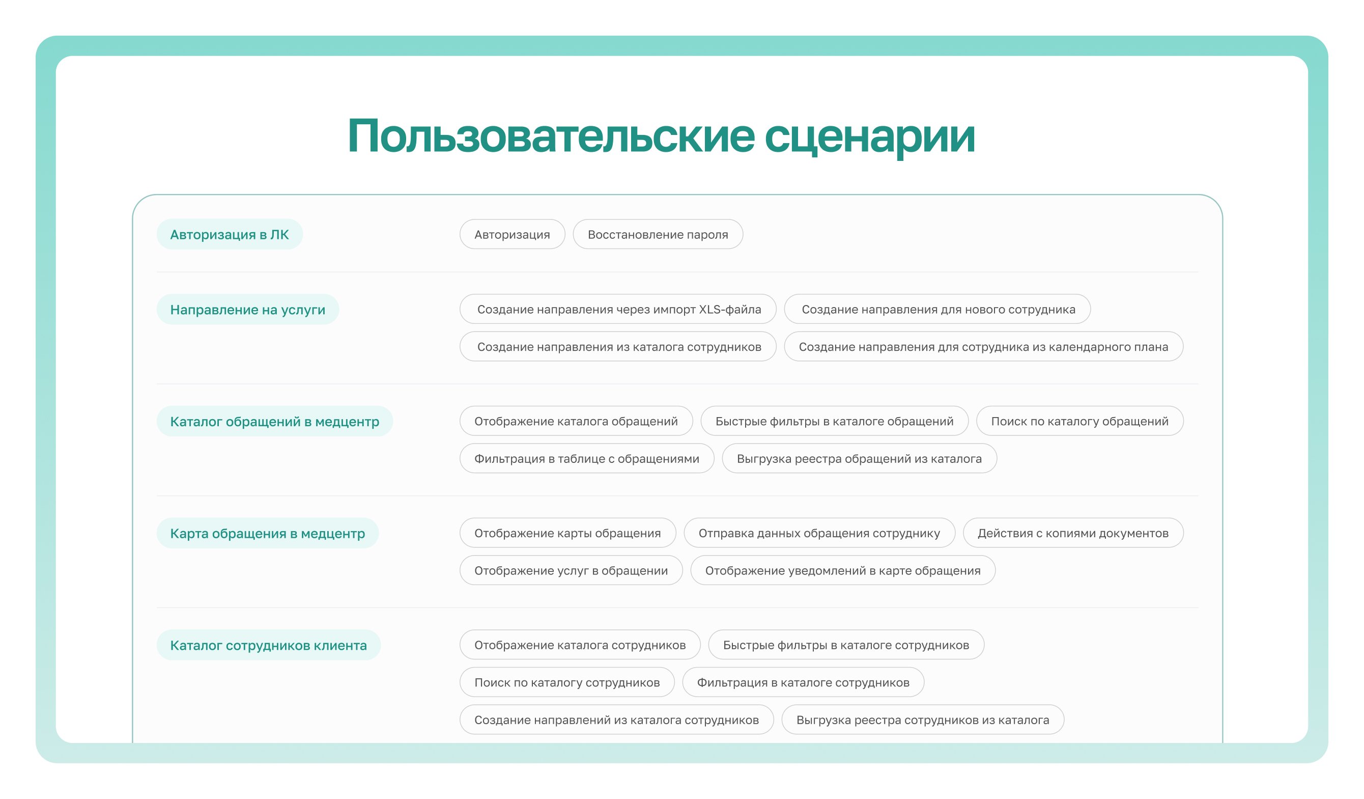 Поэтому сначала мы описали будущий порядок работы уже с личным кабинетом. Мы разобрали, какие действия сейчас выполняют сотрудники клиники и компании-клиента, и посмотрели, какие из них можно перенести в личный кабинет.