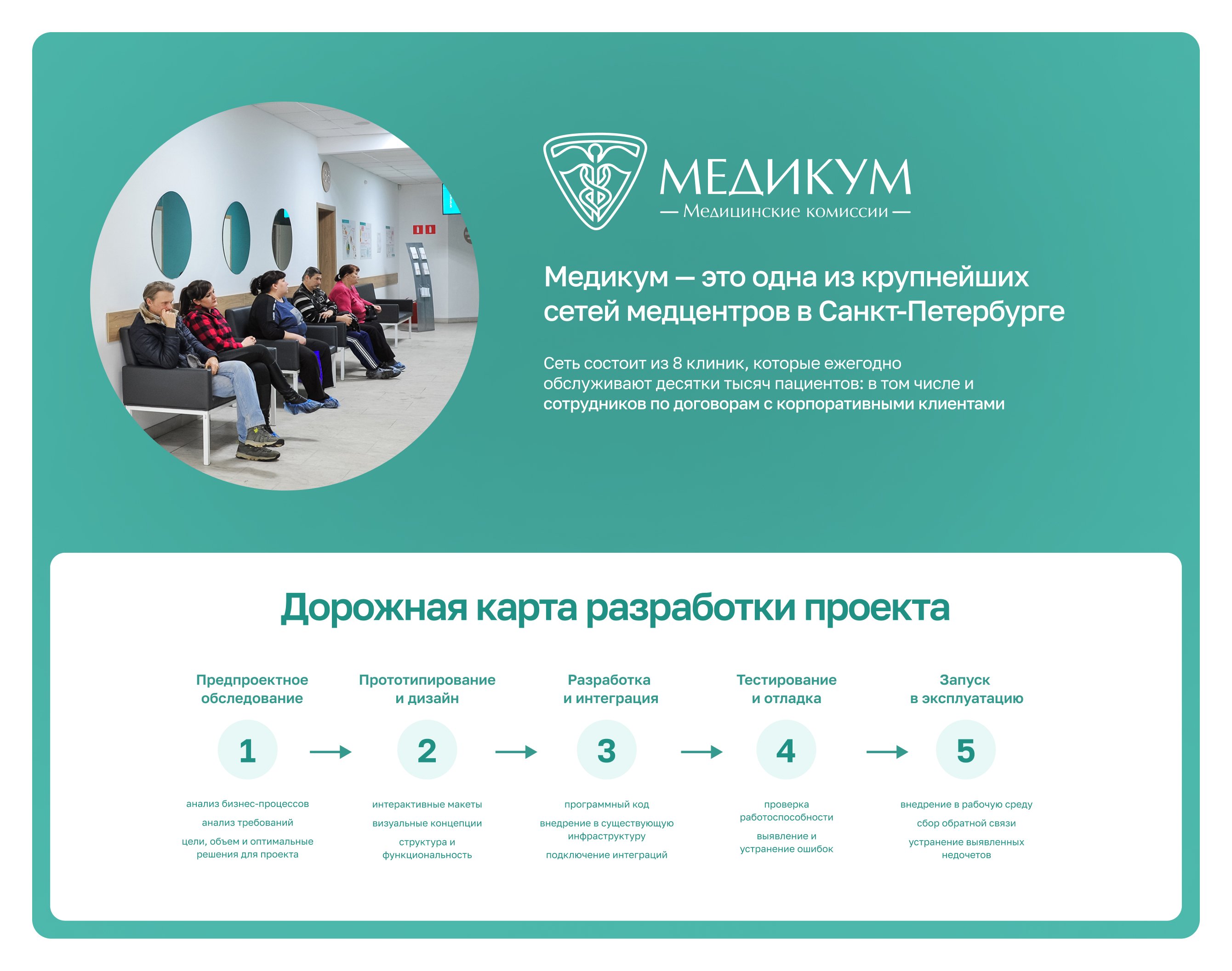 При поиске ИТ-решения «Медикум» обратили внимание на наш кейс — личный кабинет для сети медицинских центров. История оказалась знакомой, поэтому команда обратилась к нам.