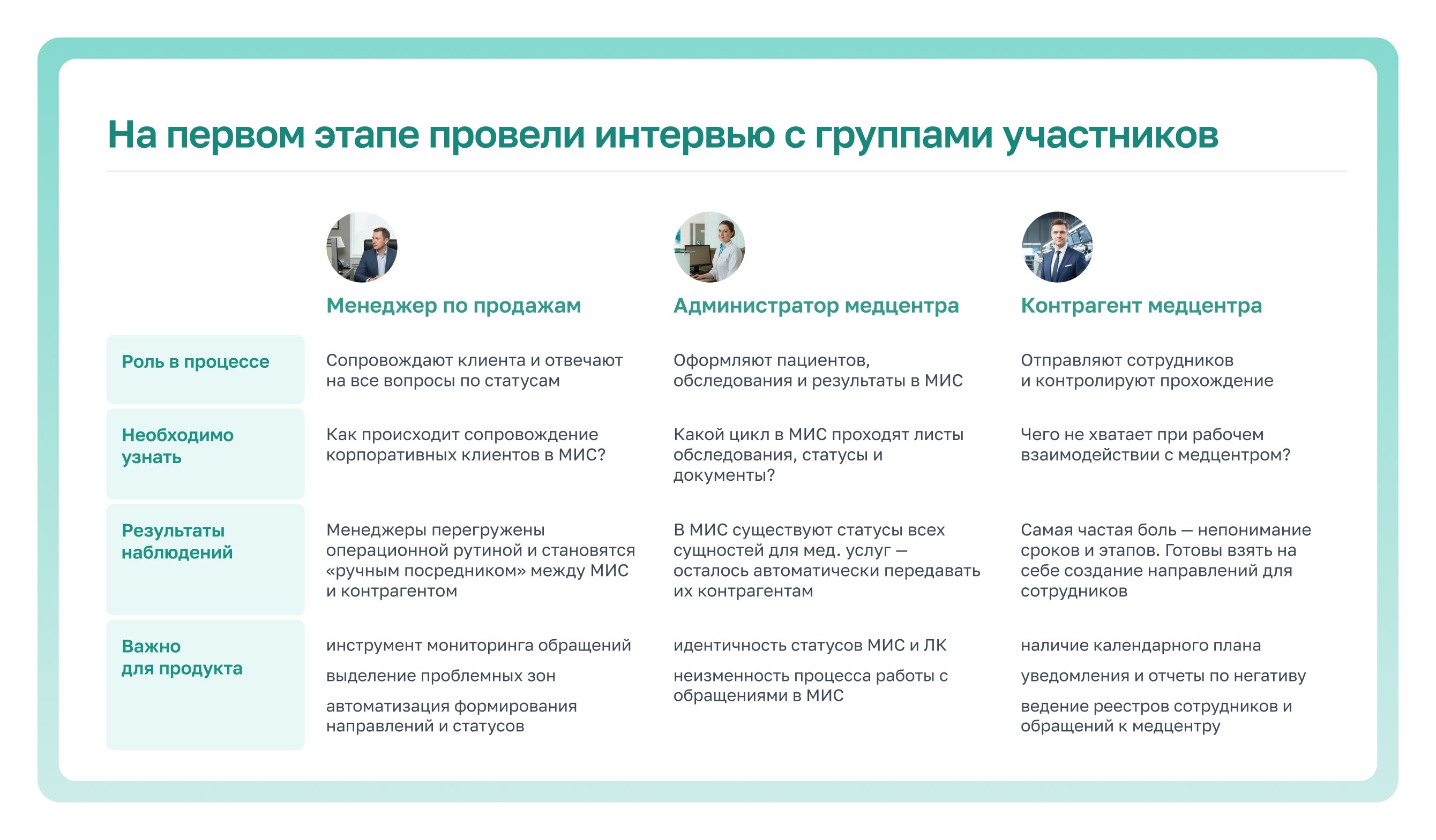 Для этого мы погрузились в реальный контекст работы. Поговорили с теми, кто ежедневно управляет процессом со стороны клиники, и с теми, кто сталкивается с ним со стороны бизнеса. Чтобы корпоративные клиенты могли свободно высказать своё мнение, провели анонимный опрос среди представителей 10 корпоративных клиентов медцентра.