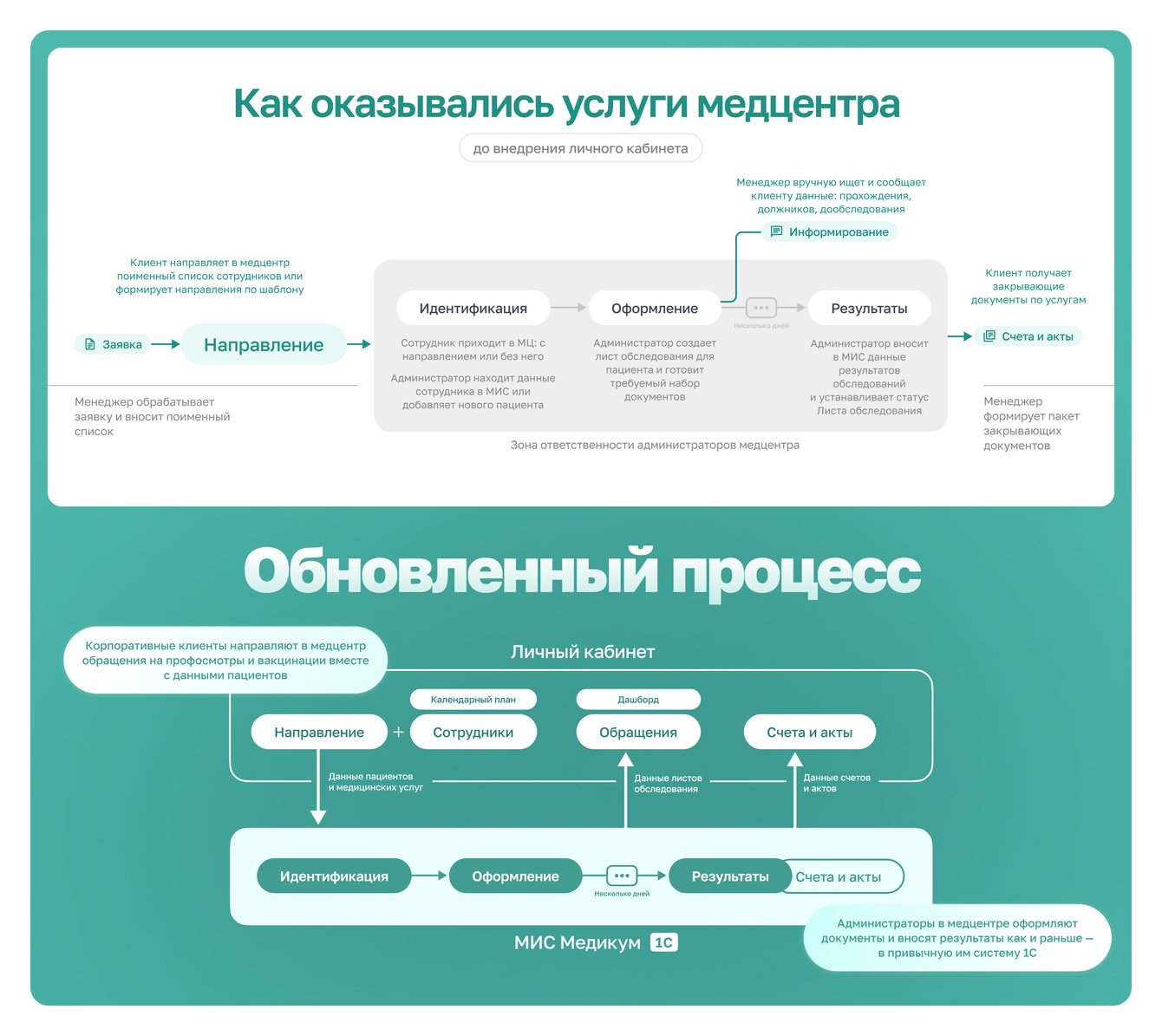 Далее определили, как должна выглядеть работа клиники и корпоративного клиента, если у них появляется личный кабинет. Это и был наш целевой процесс.