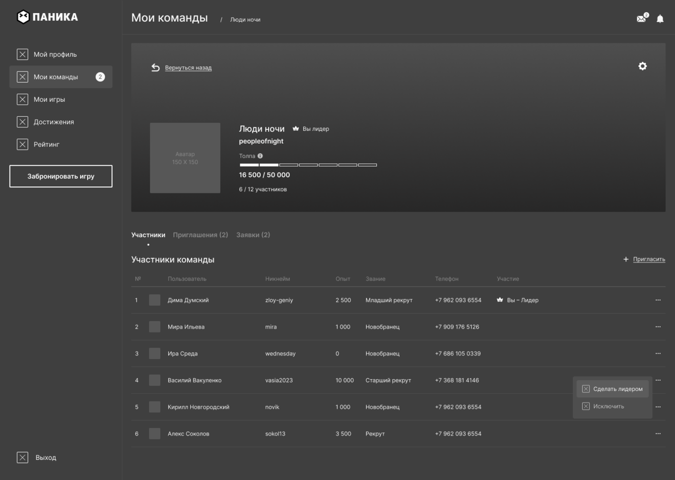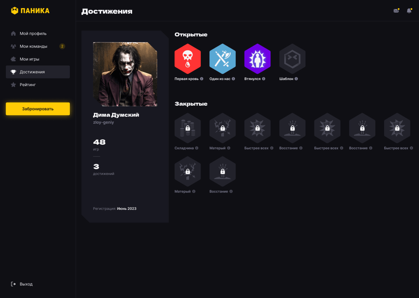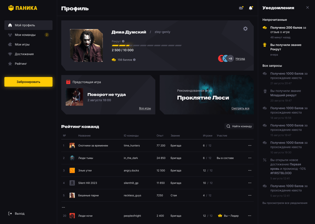 Задача: разработать личный кабинет игроков сети квестов, реализовать возможность организовываться в команды, накапливать опыт, баллы, получать ачивки, использовать баллы как скидки при бронировании игр.