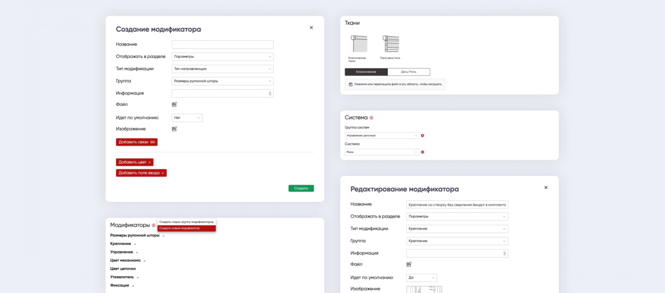 Через админский кабинет можно настраивать все модификации товаров, которые выводятся на клиентскую часть конструктора: добавлять ткани и новые цвета, менять комплектацию.