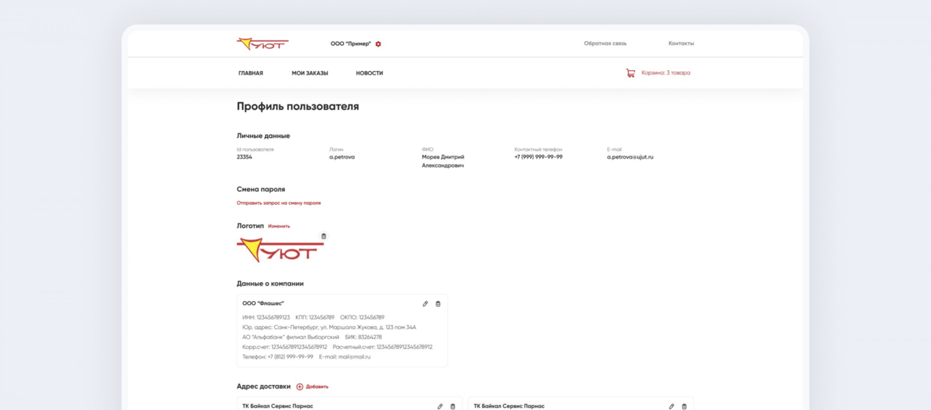 В профиль пользователя подтягиваются все данные: ID пользователя, его логин и ФИО, данные о компании, адрес доставки и данные грузополучателя.