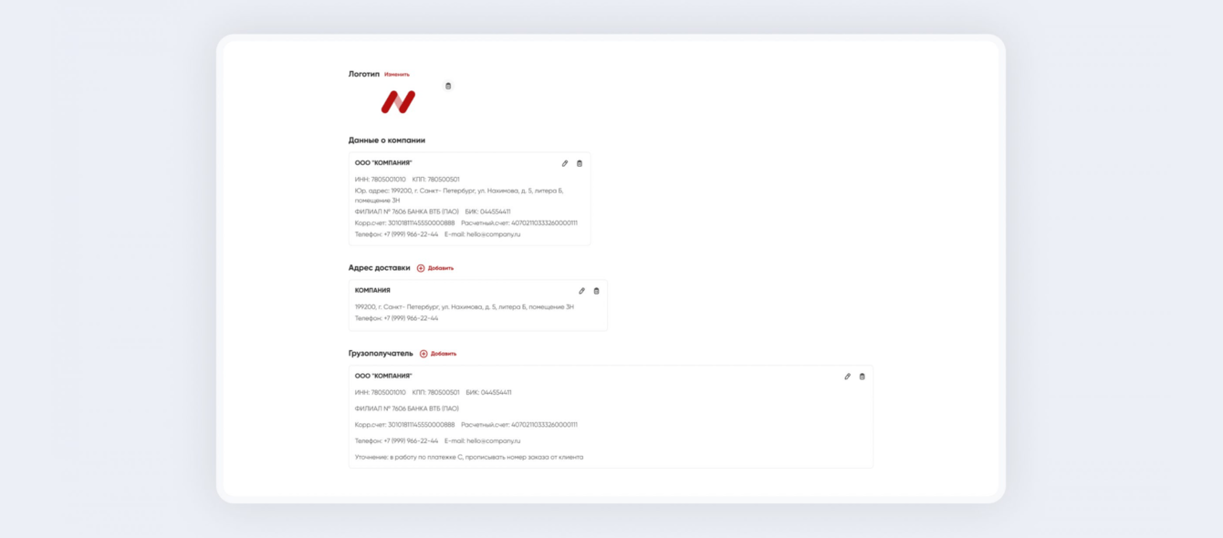 В профиль пользователя подтягиваются все данные: ID пользователя, его логин и ФИО, данные о компании, адрес доставки и данные грузополучателя.