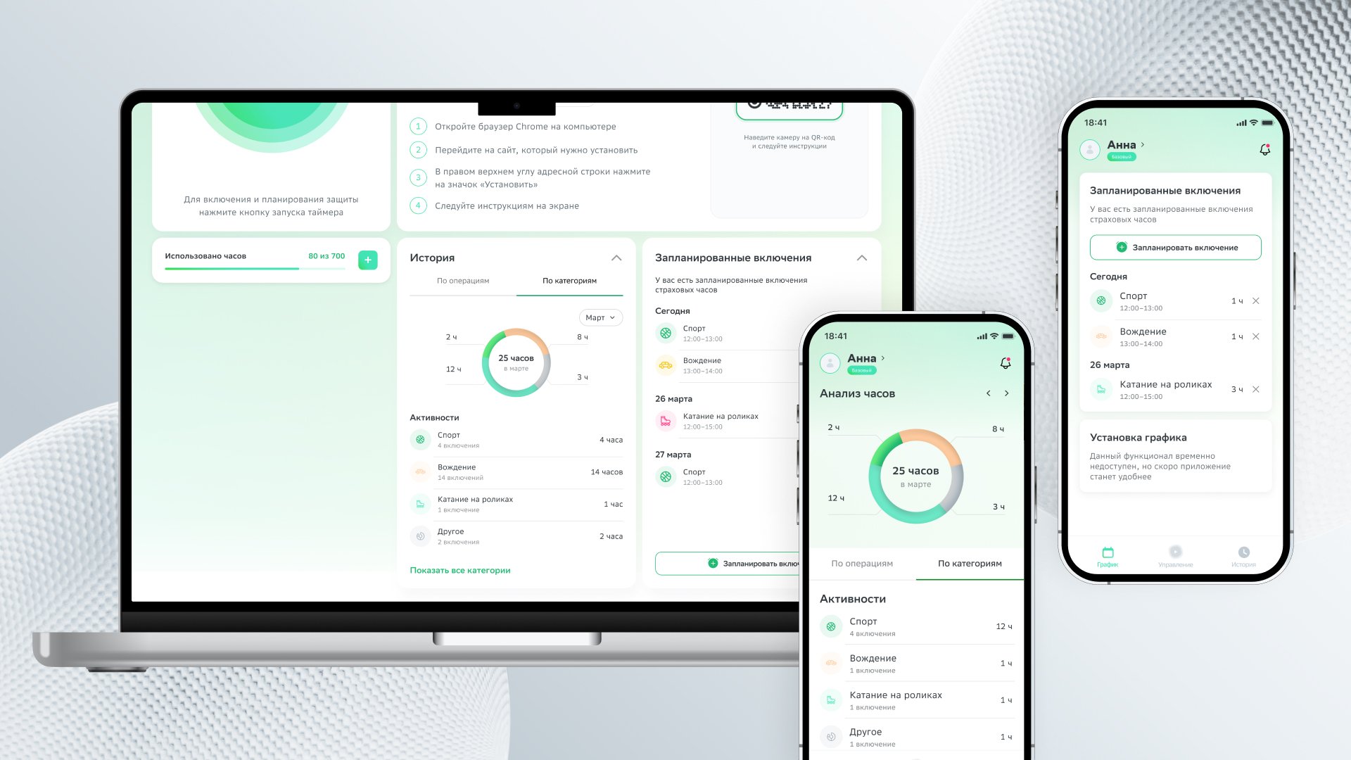 Получился удобный личный кабинет для управления продуктом«Страхование по часам» от СберСтрахования жизни. В личном кабинете можно настраивать продукт под себя: включать и выключать страховые часы, просматривать историю операций, планировать графики включения часов.