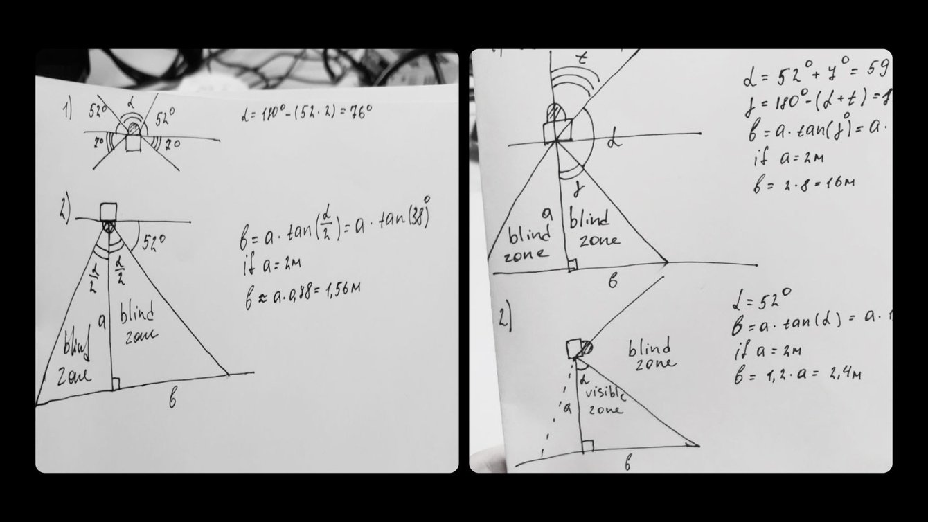 Высота, на которой заказчик планировал устанавливать наши устройства, около 3-4 метров. Поэтому наш разработчик прямо на бумажке рассчитал, как лучше установить лидар, чтобы он получил всю нужную информацию. Оказалось, идеальный вариант, с минимальным числом слепых зон — установить лидар линзой вниз.